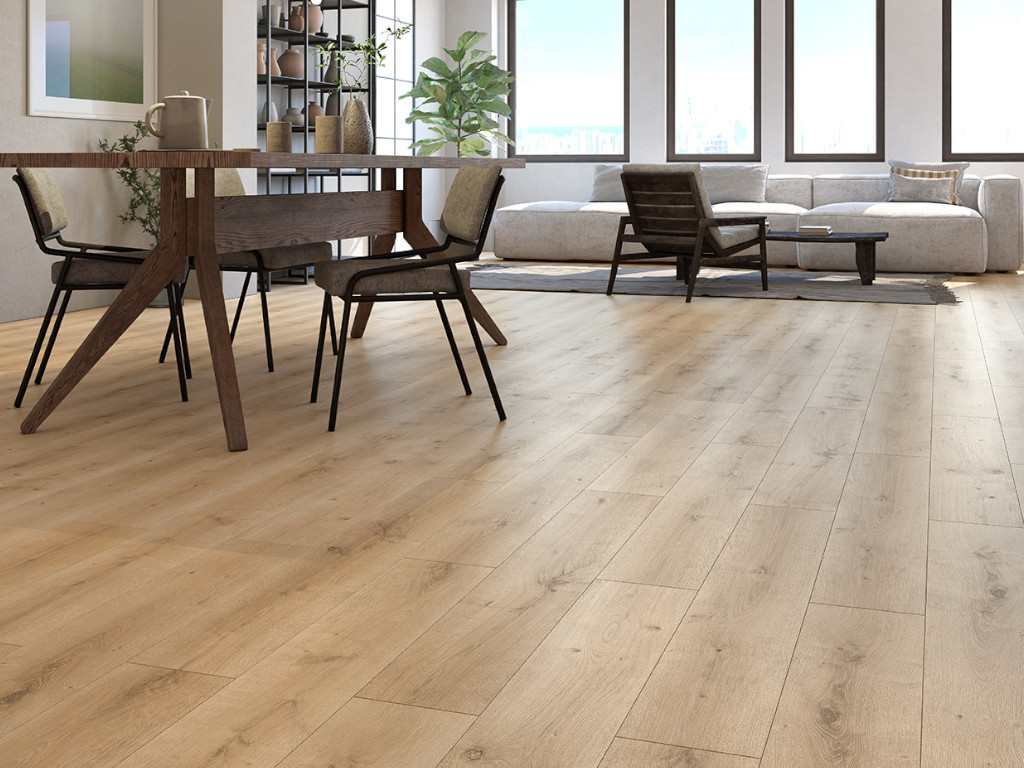 Laminaat is de ideale combinatie van design en functionaliteit. De moderne uitstraling en de bijzonder onderhoudsvriendelijke toplaag van deze laminaatvloer maken dit de perfecte vloer voor bijna elke ruimte.