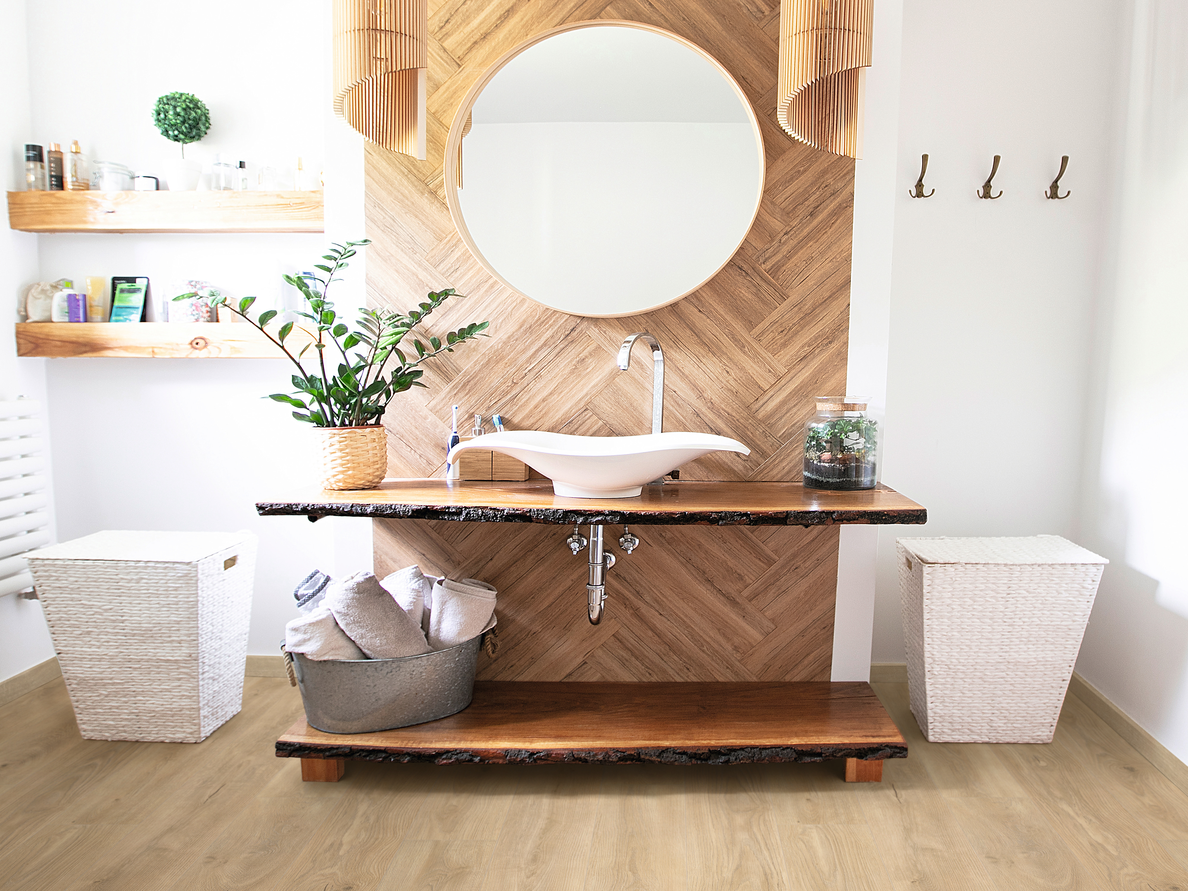 1288 × 195 x 8 mm, kliksysteem, geschikt voor vochtige ruimtes, houtnerfstructuur over het gehele oppervlak, afgeschuinde rand aan 4 zijden