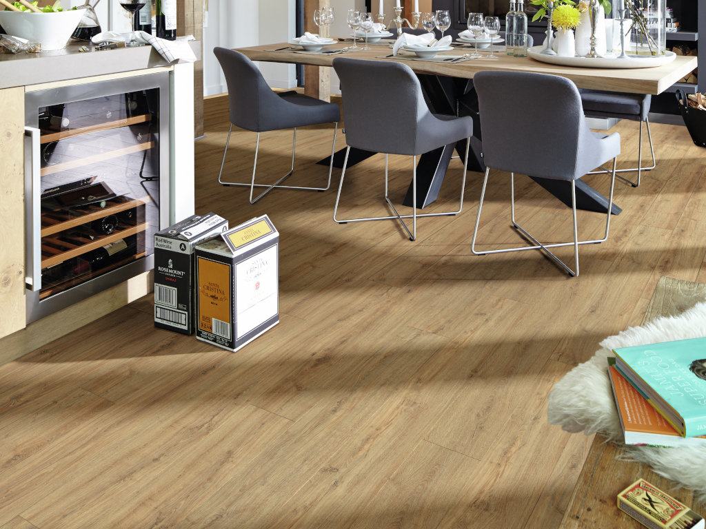 Dankzij de weerstand tegen vocht, te danken aan de waterresistente dragerplaat, kan deze laminaatvloer ook in vochtige ruimtes zoals badkamer of keuken worden gelegd. Deze vloer kan probleemloos worden gelegd op een warmwater-vloerverwarming.