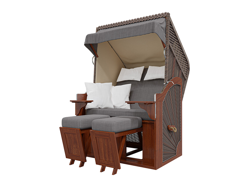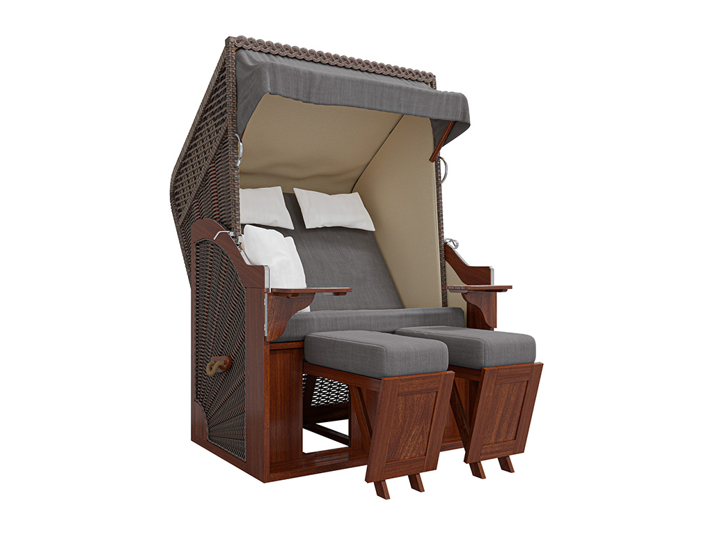 De Strandkorb is een 2-zits strandstoel die uitnodigt om te dromen en te ontspannen dankzij de hoogwaardige afwerking van massief grenenhout en roestvrijstalen beslag, ongeacht het seizoen.