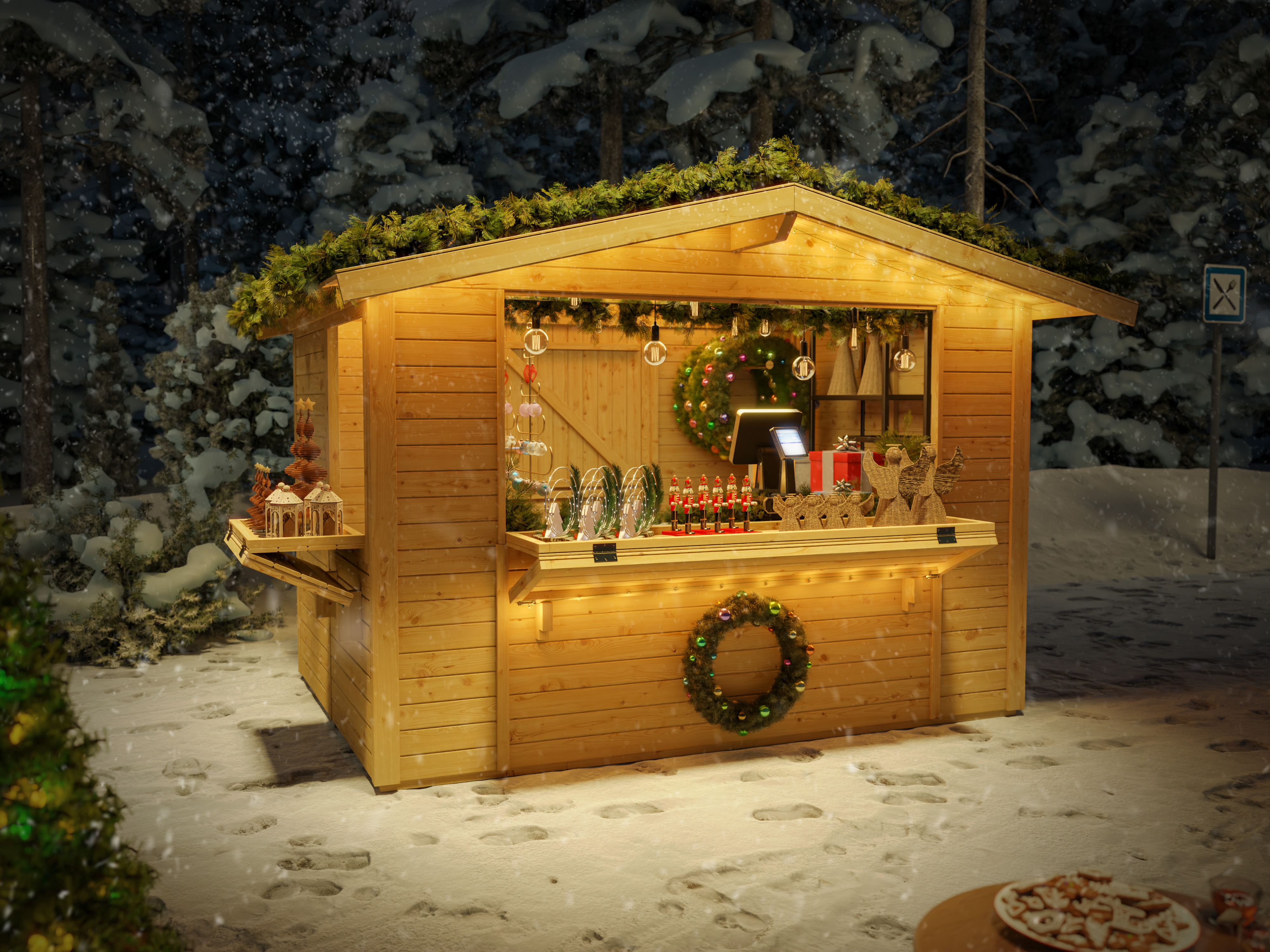 De wandelementen zijn gemaakt van 19 mm dik, natuurlijk hout, dat samen met de 15 mm dikke dakpanelen de marktkraam de nodige stabiliteit geeft.