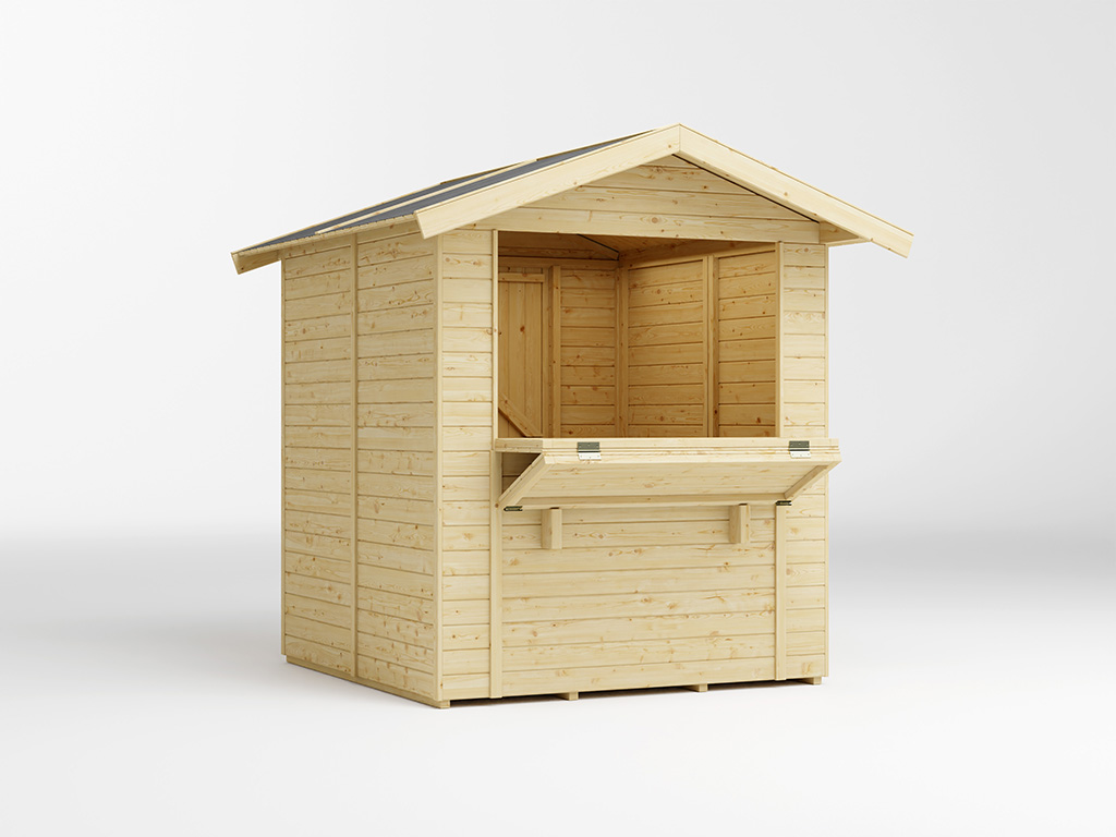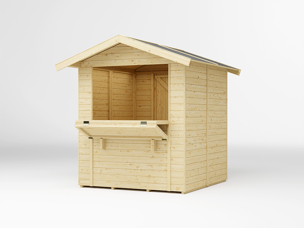 De marktkraam van noordelijk vurenhout biedt bij geopend verkoopvenster een praktische luifel die je goederen en ook je klanten tegen regen en sneeuw beschermt. - Eenvoudige montage