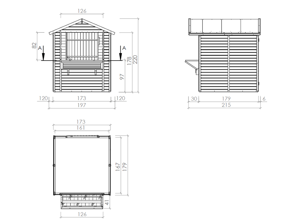 | Buitenmaten met dakoverstek (B x D): | 197 x 215 cm |