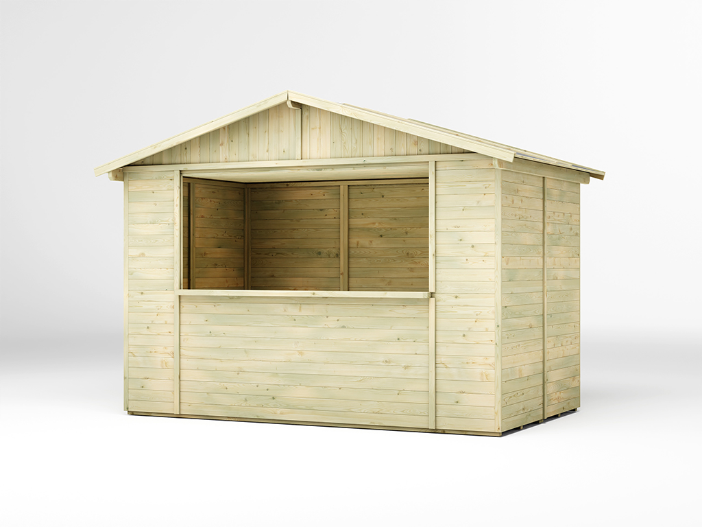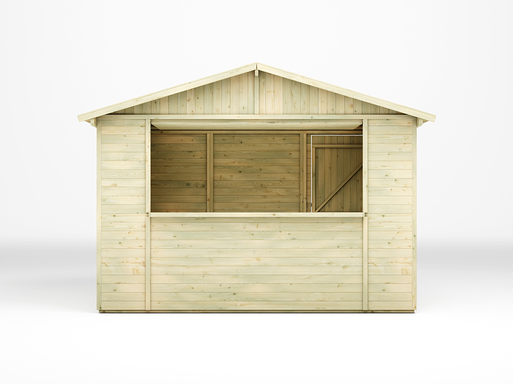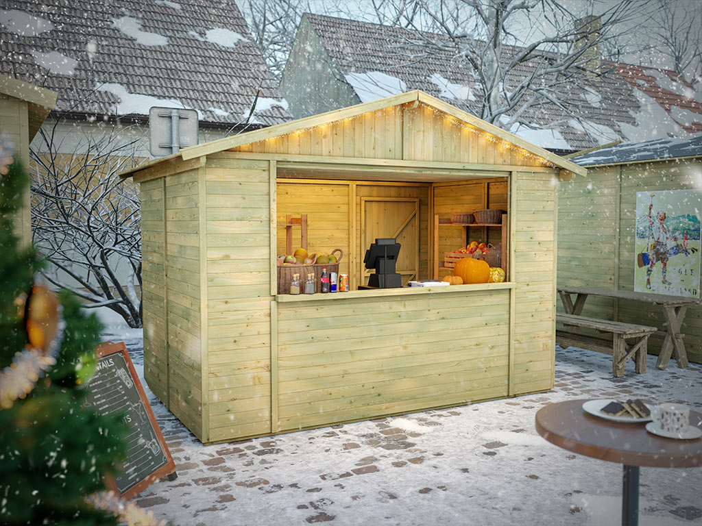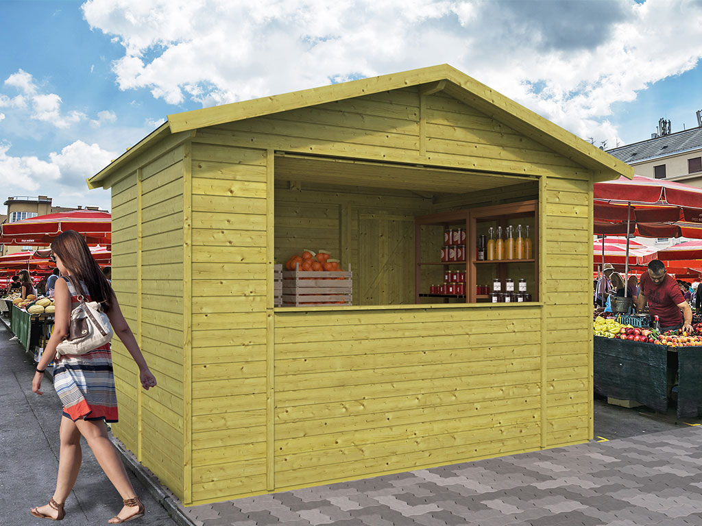 De marktkraam is gemaakt van geïmpregneerd hout en is daardoor beschermd tegen weersinvloeden.