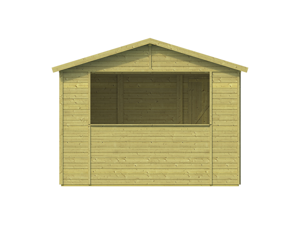 Grote marktkraam/verkoopkraam met verkoopopening en zadeldak.