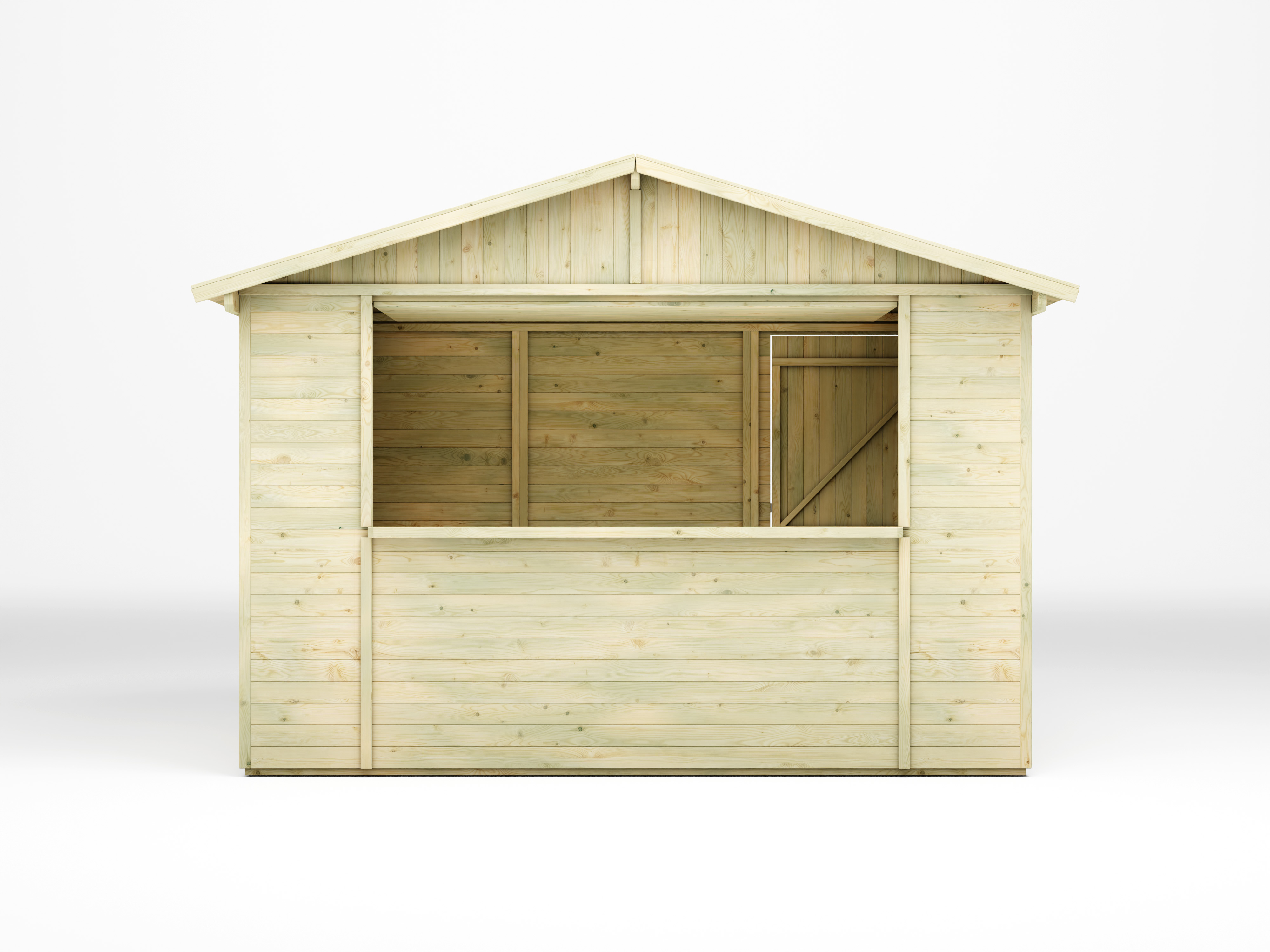 Grote marktkraam/verkoopkraam met verkoopopening en zadeldak.