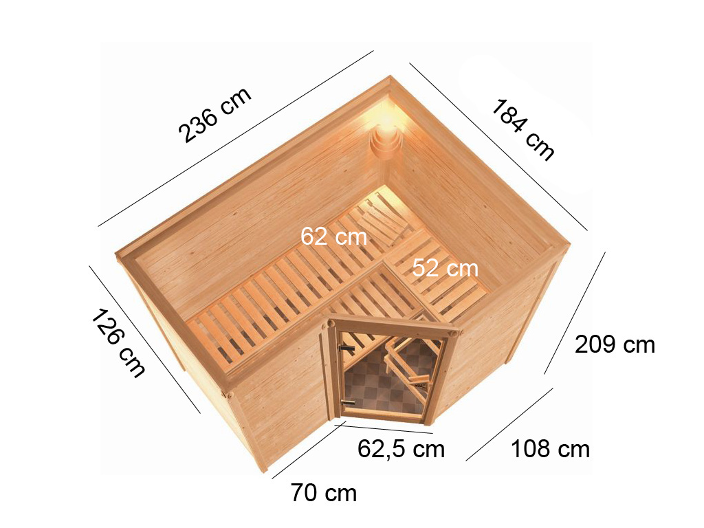 - Binnenafmetingen: De binnenafmetingen van deze sauna met B 225 x D 173 x H 200 cm maken een saunabezoek van 2-3 personen tegelijkertijd mogelijk.