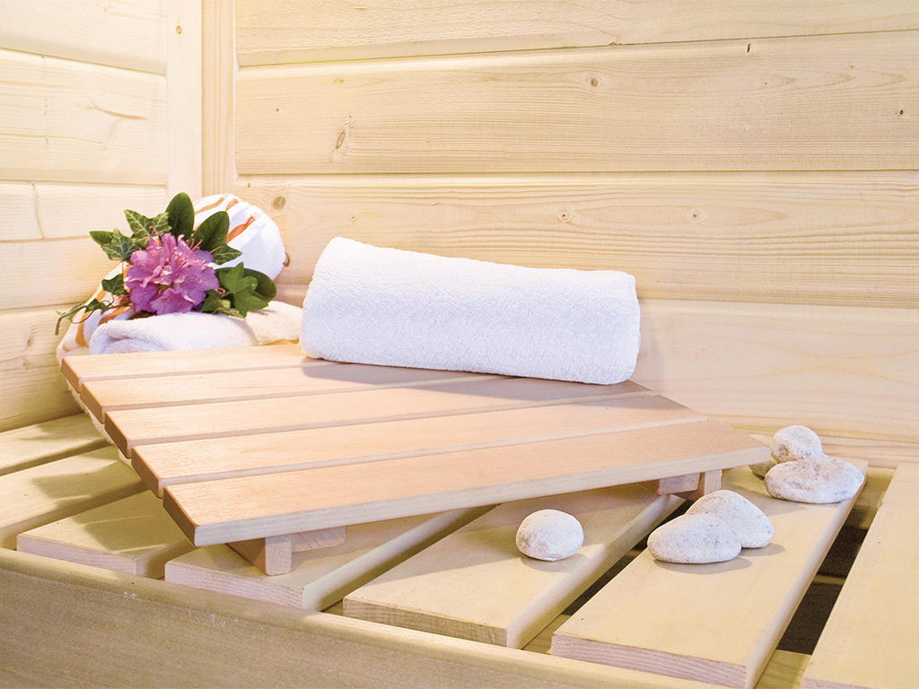 - Saunabedden: Met 3 ligbanken is de ervaring voor elke saunagast bijzonder aangenaam. De basisuitrusting omvat de volgende banken: 1 ligbank 62 cm breed, 1 ligbank 57 cm breed, 1 ligbank 52 cm breed, massief espenhout.