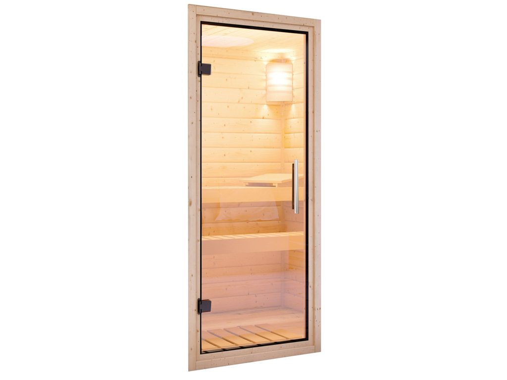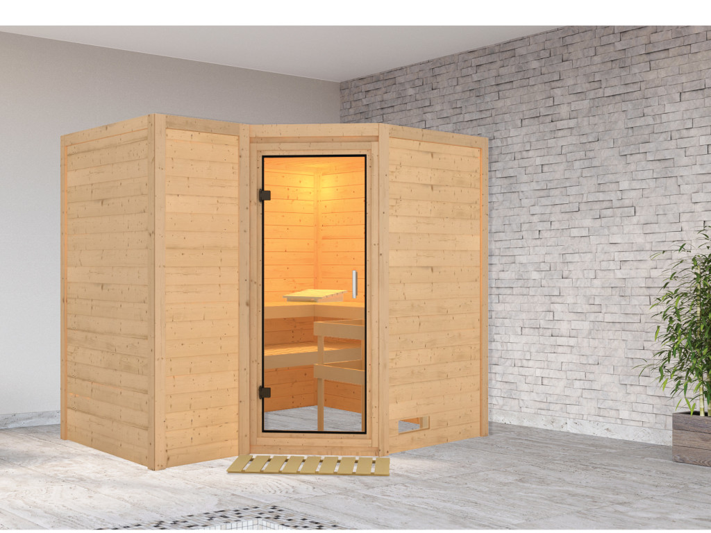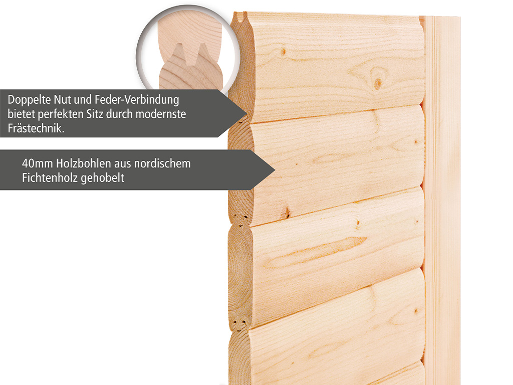 Deze massief houten sauna bestaat uit 38 mm dikke massief houten planken en een dak geïsoleerd met minerale wol en bekleed met Softline profielhout. Een steek- en schroefsysteem zorgt voor een snelle en ongecompliceerde montage. Dubbele groef- en tandverbindingen fixeren de saunaconstructie maatvast.