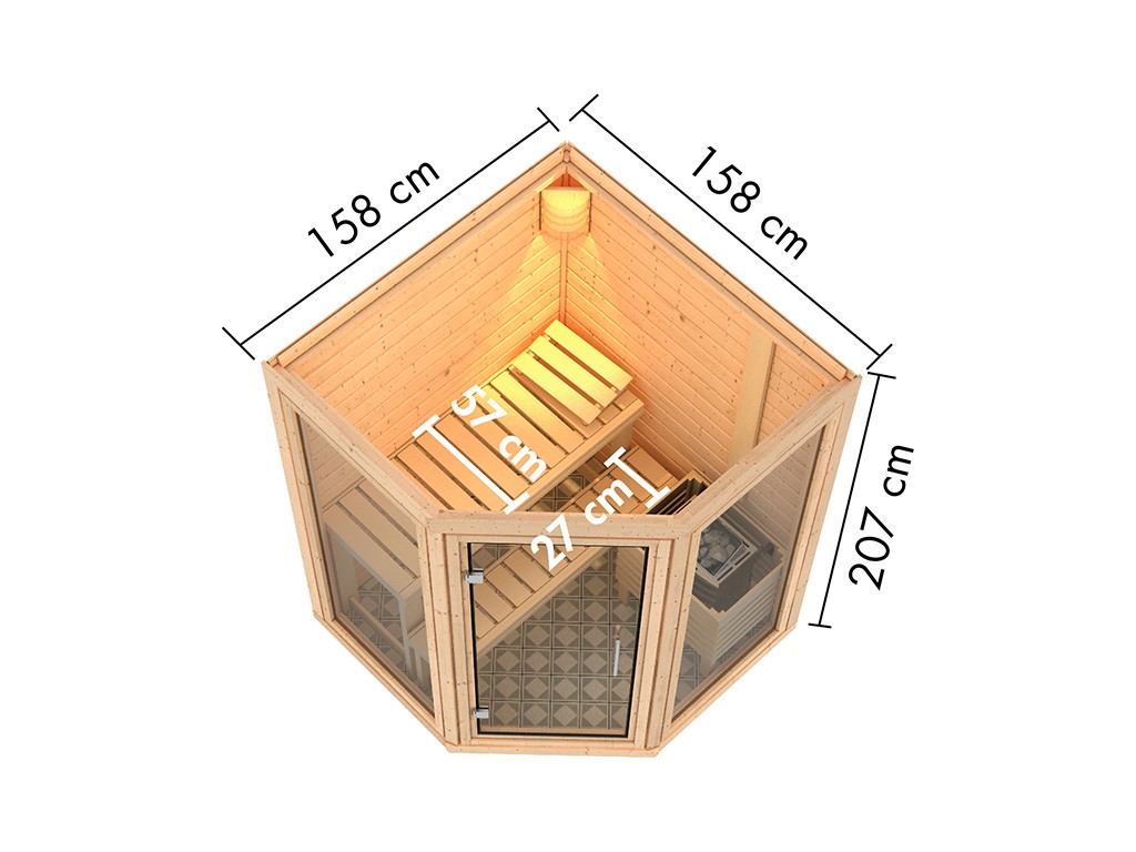 B x D x H: 158 x 158 x 207 cm, hoekinstap, incl. 2 ligbanken & 1 hoofdsteun, incl. 9 kW kachel met geïntegreerde bediening, diabaasstenen