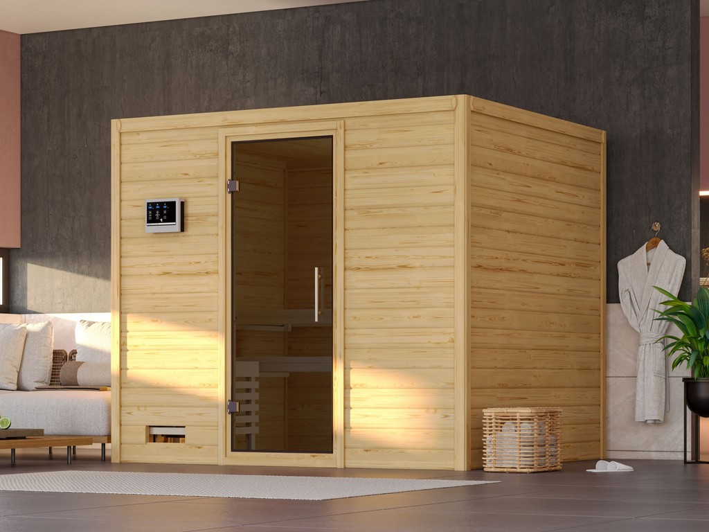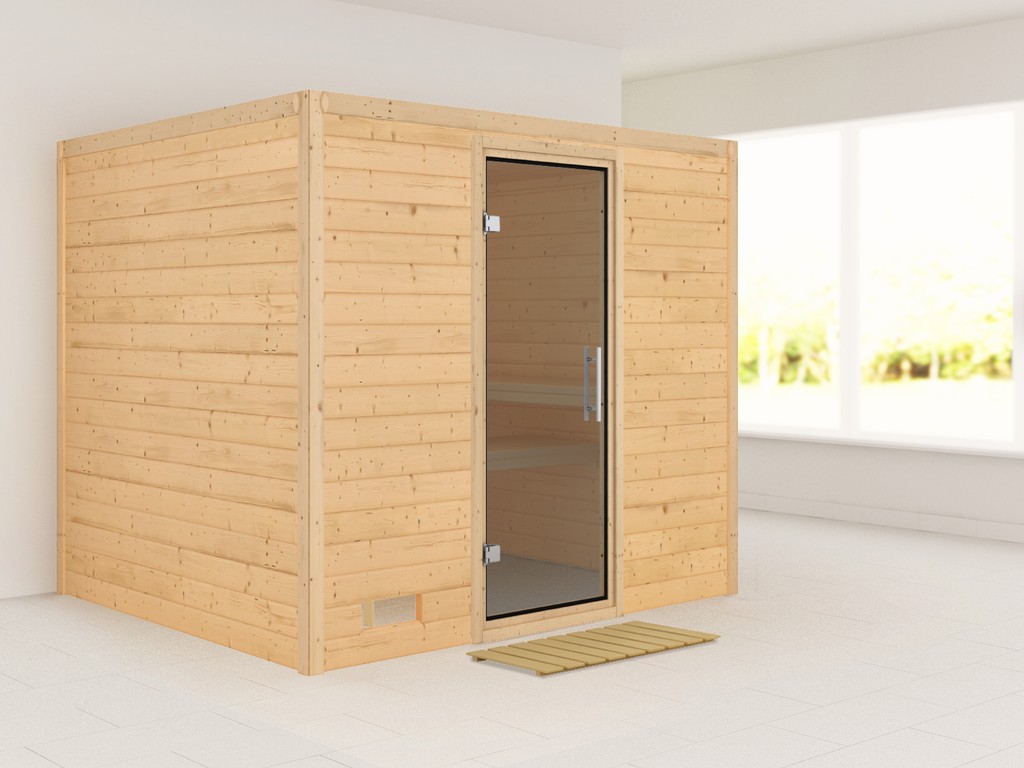 Dit saunamodel - een systeem- of elementsauna - kenmerkt zich door zijn bijzondere sandwichconstructie, wat betekent dat de wandelementen bestaan uit afzonderlijke lagen. De reeds voorgefabriceerde wandelementen zorgen voor een snelle installatie binnen enkele uren.