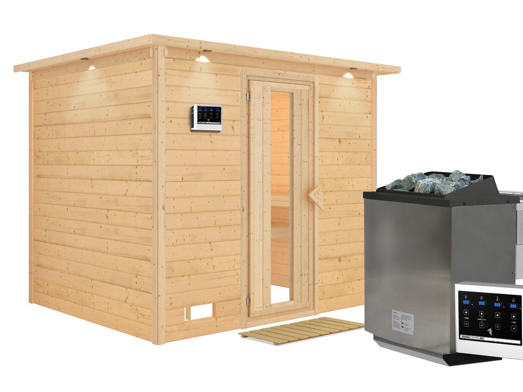 Massieve sauna Sonara met dakkraag houten deur met geïsoleerd glas incl. 9 kW Bio-kachel