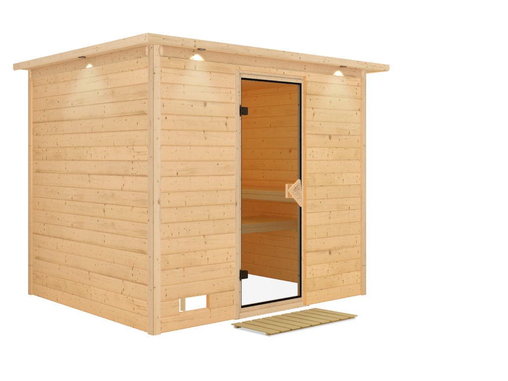 Massieve sauna Sonara met dakkraag, kompleet transparente gebronsde glazen deur