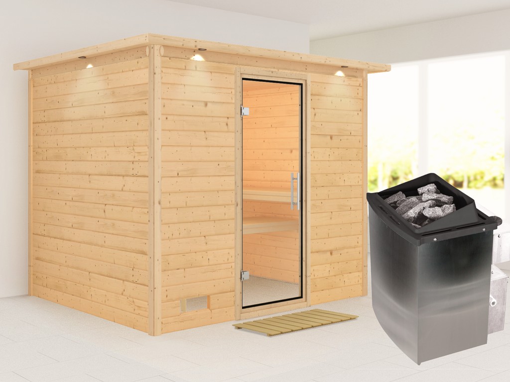 Massieve sauna Sonara met dakkraag, transparent glazen deur + 9 kW saunakachel met besturing