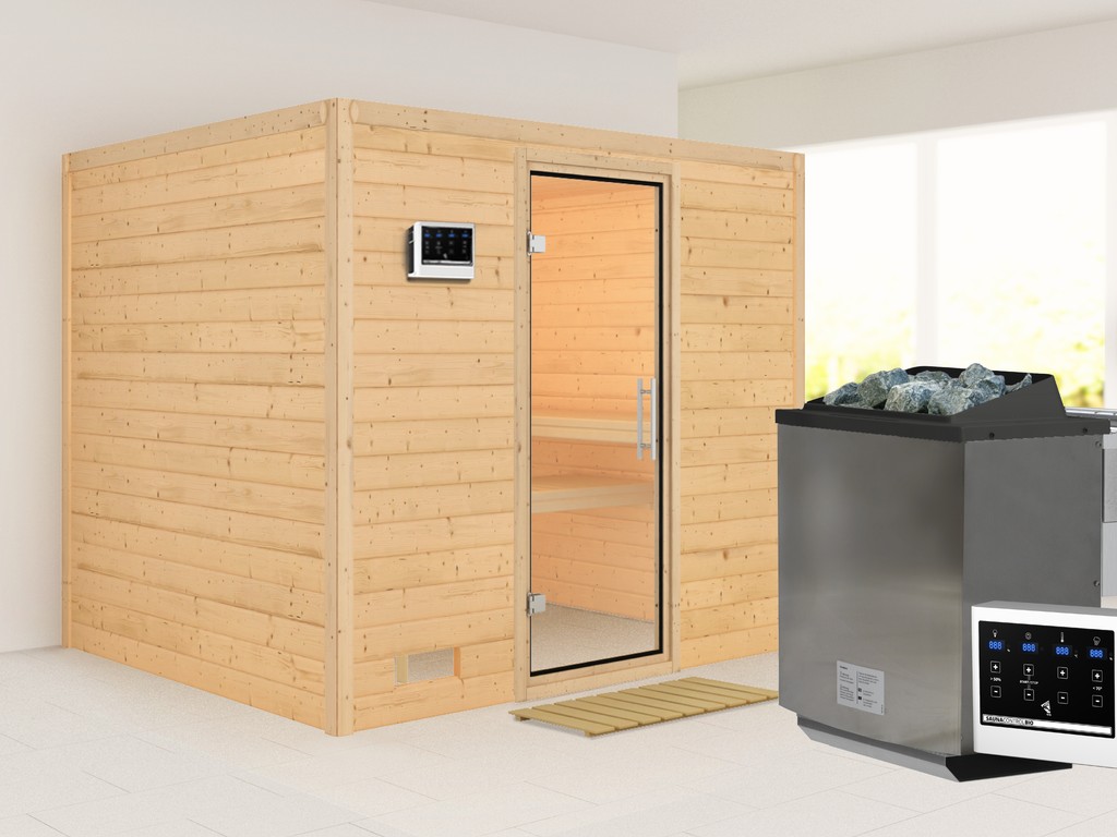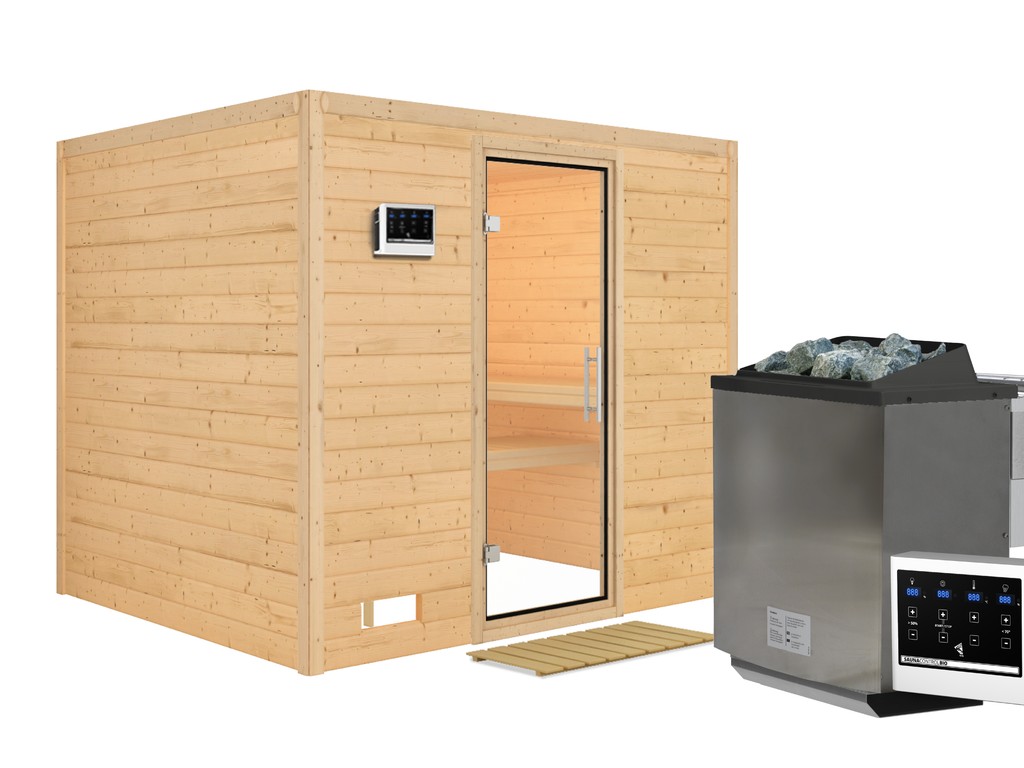 Massieve sauna Sonara transparent glazen deur + 9 kW Bio-Combi-kachel met ext. besturing