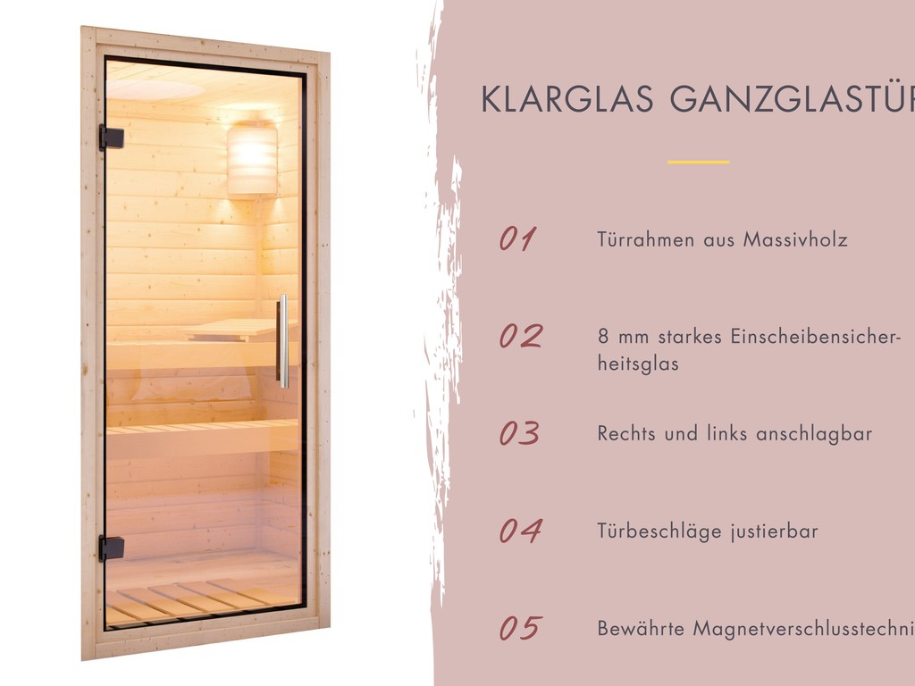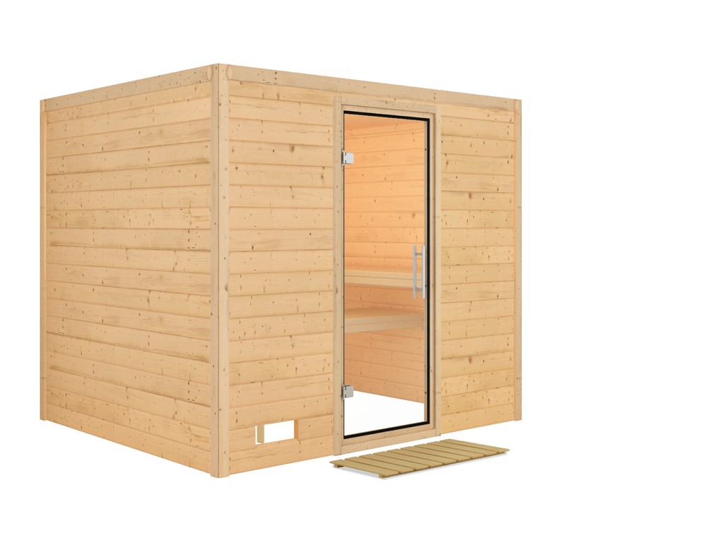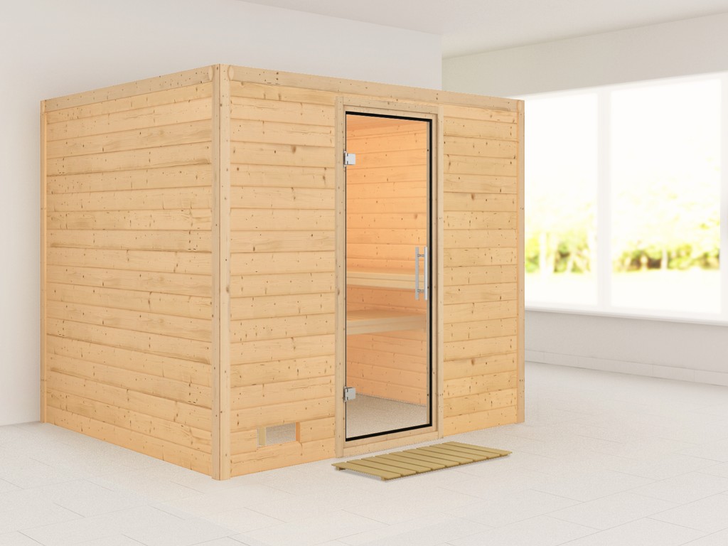 Dit saunamodel - een systeem- of elementsauna - kenmerkt zich door zijn bijzondere sandwichconstructie, wat betekent dat de wandelementen bestaan uit afzonderlijke lagen. De reeds voorgefabriceerde wandelementen zorgen voor een snelle installatie binnen enkele uren.