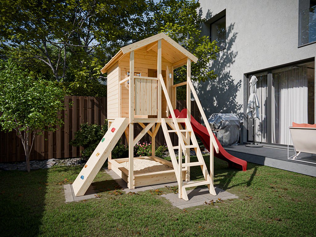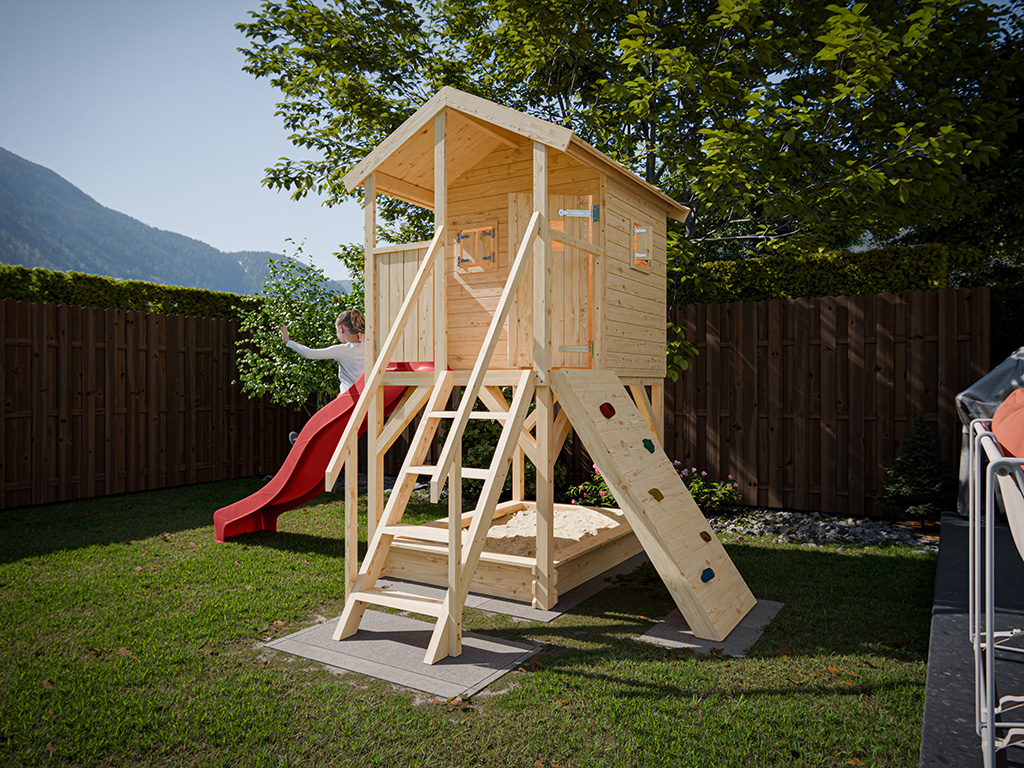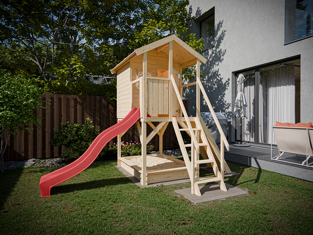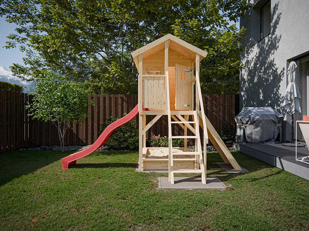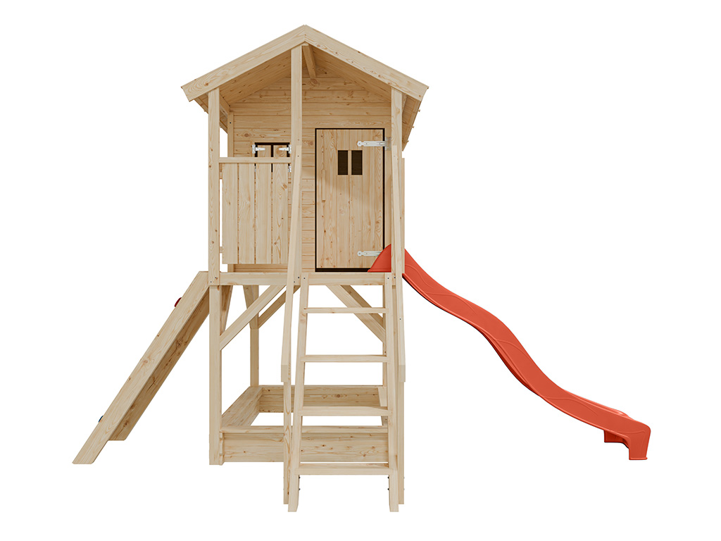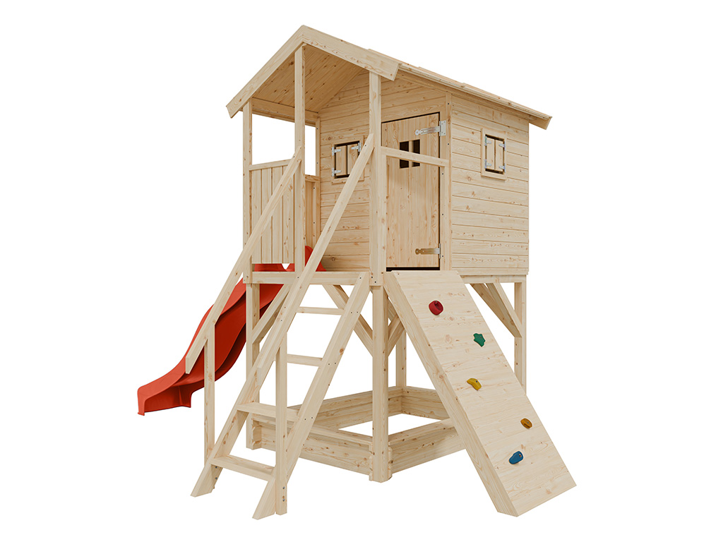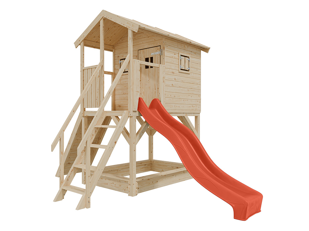 Onbehandeld speelhuisje op palen Nele incl. rode glijbaan
