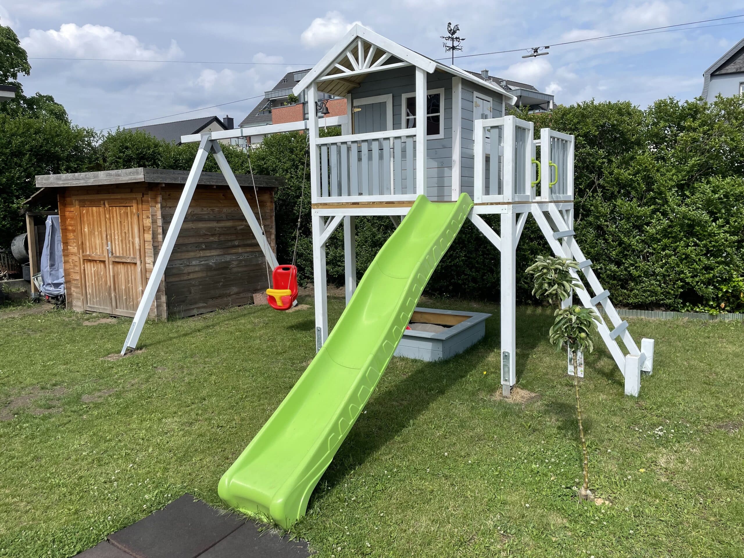 Klantenbeoordelingen voor "Geïmpregneerd speelhuisje op palen Funny XXL incl. groene glijbaan"