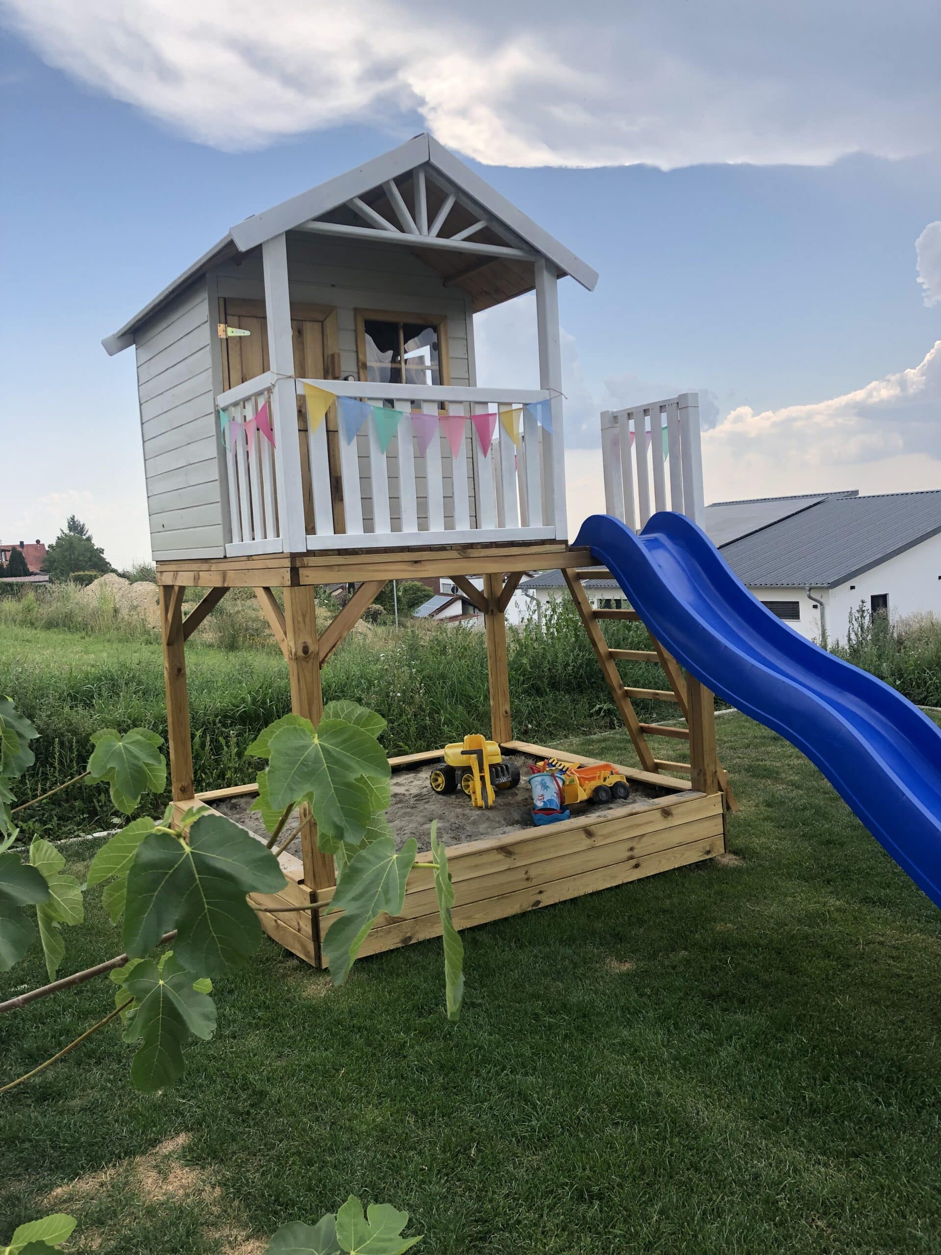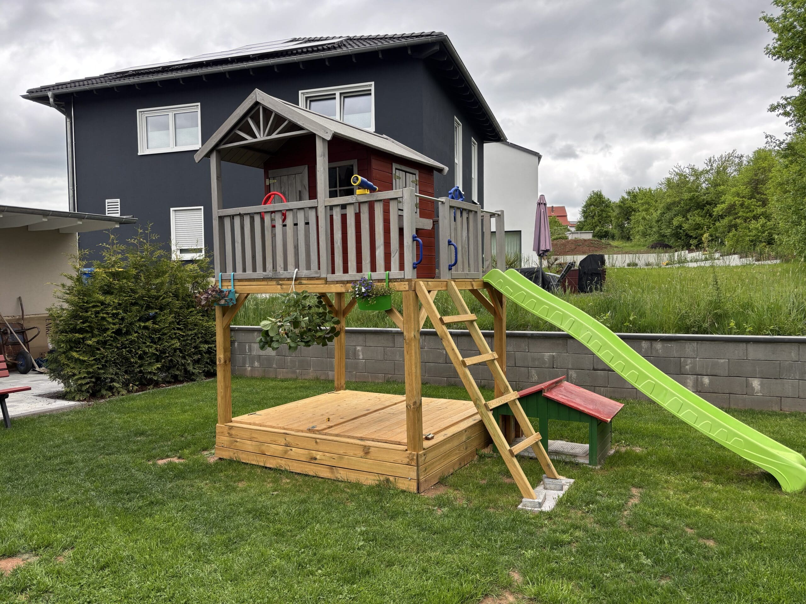 Klantenbeoordelingen voor "Geïmpregneerd speelhuisje op palen Funny XXL met zandbak incl. groene glijbaan"