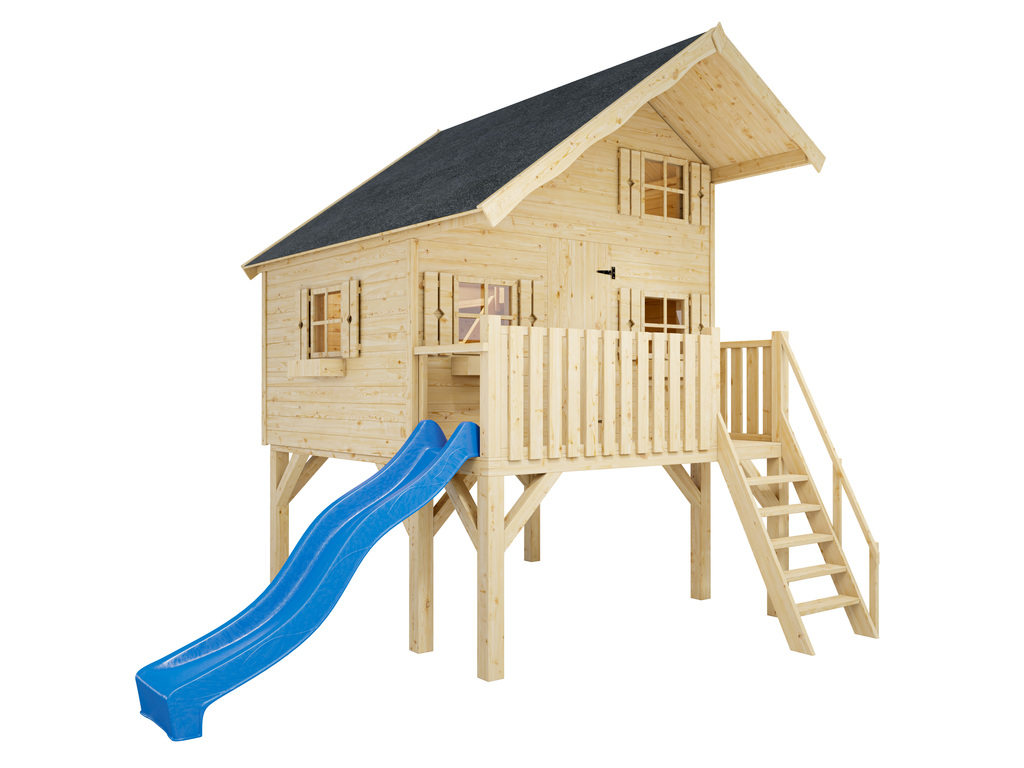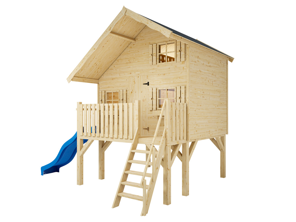 Paalhuis kinderspeelhuis Tom XL 15 mm naturel met veranda, palen en glijbaan