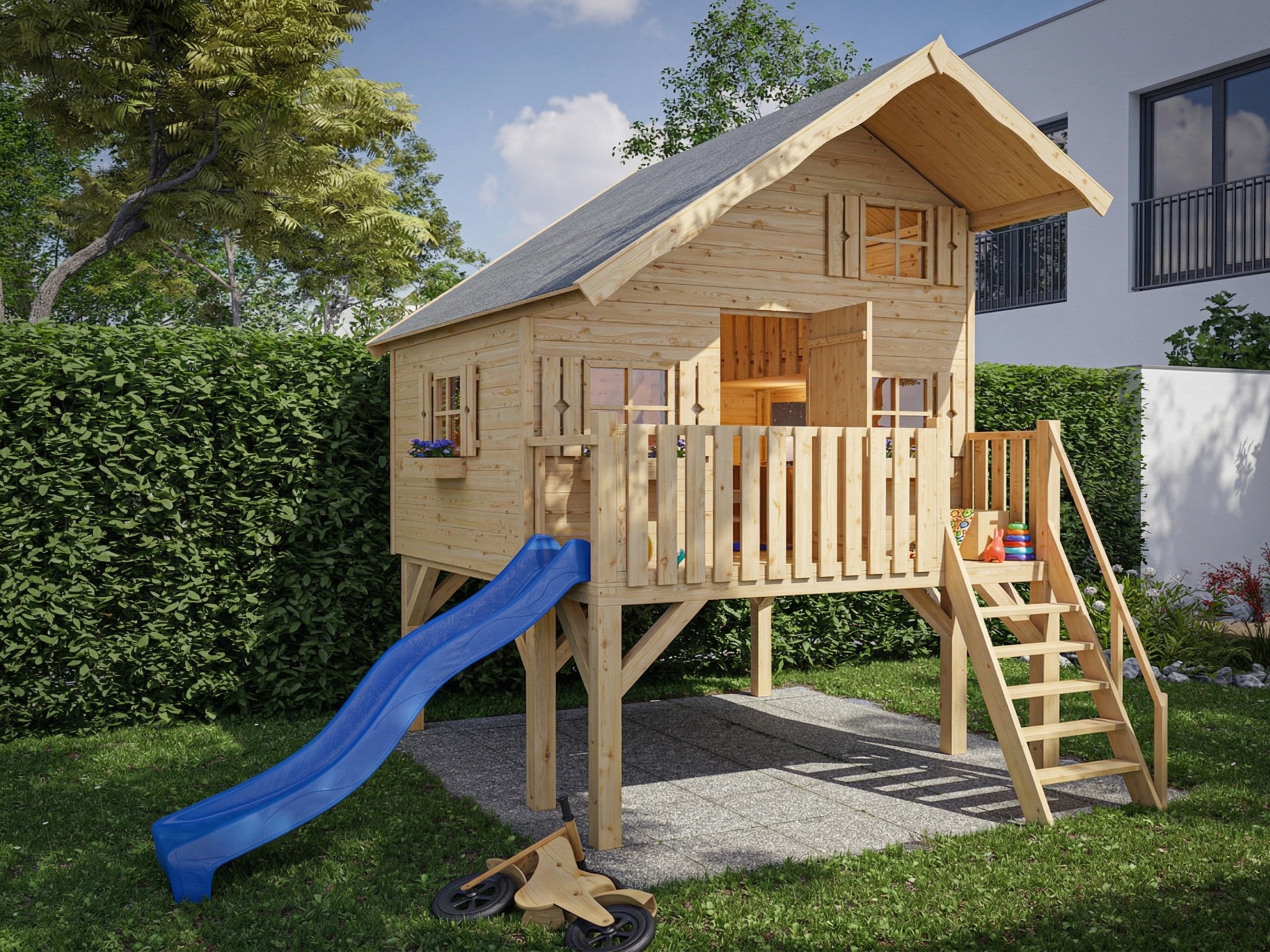 De tweede verdieping biedt extra ruimte en is een uitstekende schuilplaats voor je kleintjes. De meegeleverde ramen, inclusief bloembakken en raamluiken, geven het kinderspeelhuis een veilige en huiselijke sfeer. - Gezellige speelsfeer