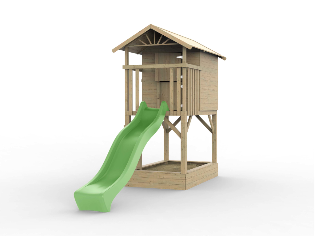 Geïmpregneerd speelhuisje op palen "Tree Hut" met zandbak incl. groene glijbaan