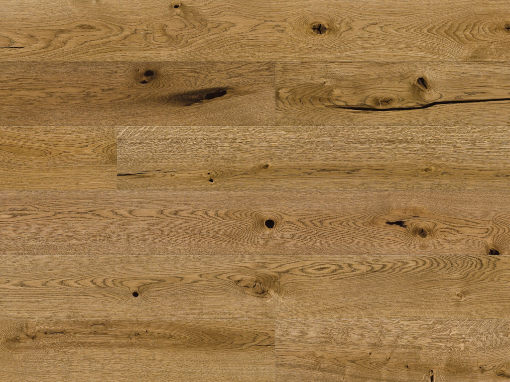 Dit parket heeft een rustieke tekening: er zijn veel donkere noesten en enkele scheuren in het hout zichtbaar.