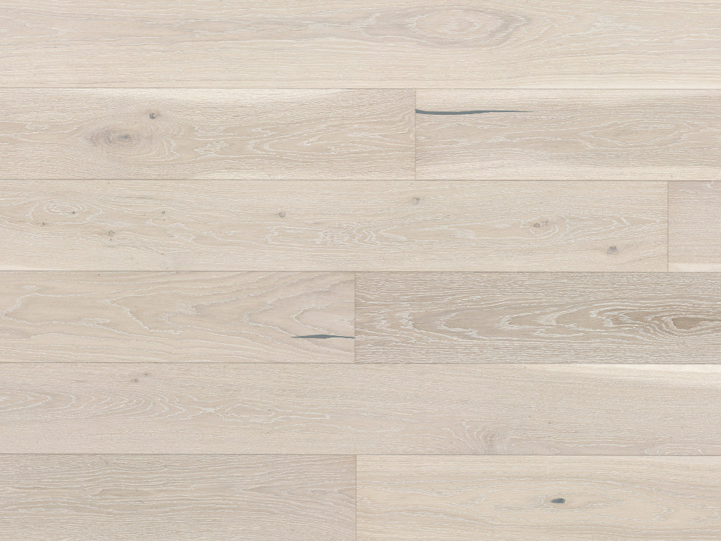 Het parket is klassiek gemaserd: er komen slechts enkele kleine zwarte noesten voor. Af en toe zijn er ook fijne scheurtjes in het hout te zien.