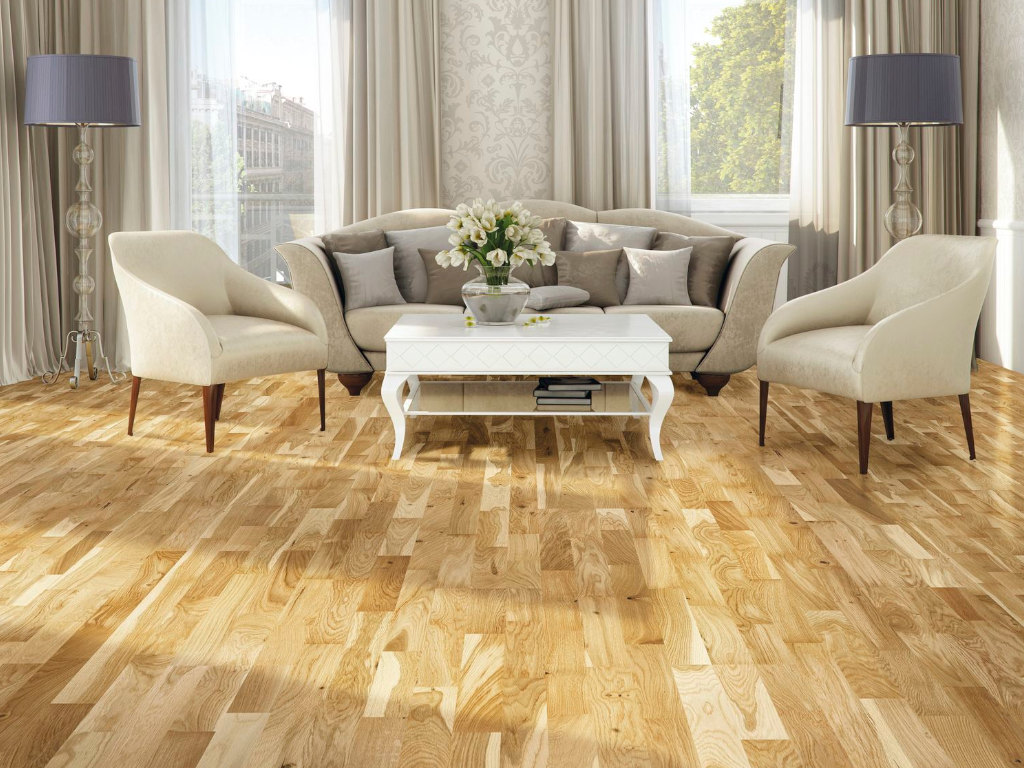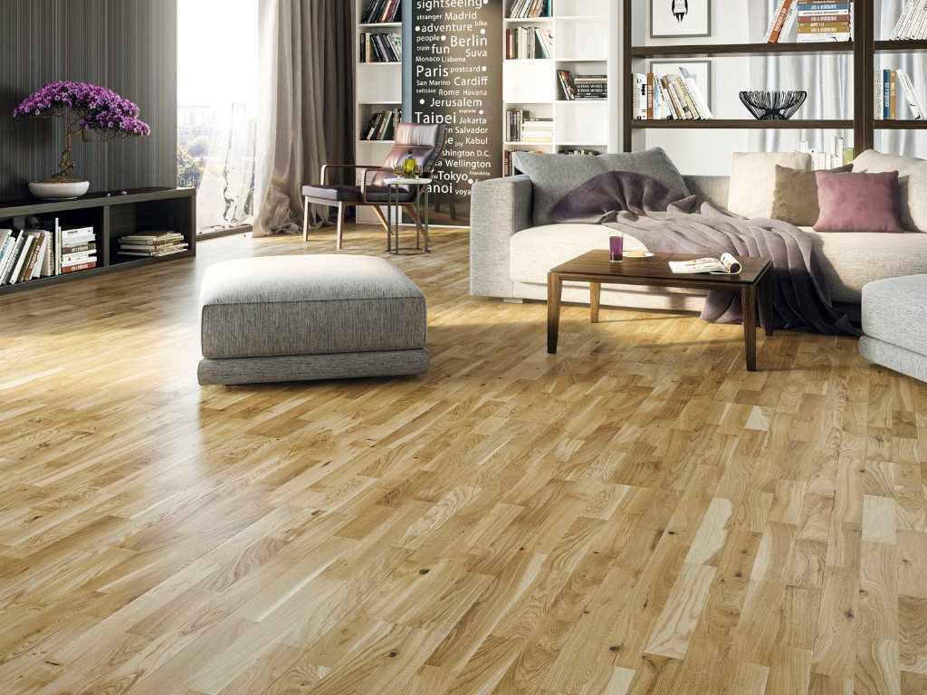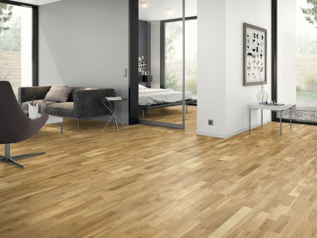 Het eikenhout geeft deze vloer een oerdegelijk karakter en schenkt iedere ruimte stijlvolle warmte en geborgenheid. Naast zijn luxueuze uitstraling is eikenhout relatief hard en tegelijkertijd veerkrachtig bij belasting. Het scheepsdeelpatroon oogt door de combinatie van verschillende, verspringend geplaatste stroken bijzonder levendig. In combinatie met de rechte belijning komt de vloer tegelijkertijd klassiek en tijdloos over. Door de voegloze uitstraling sluit plank na plank naadloos op elkaar aan – voor een egaal totaalbeeld dat de ruimte optisch vergroot.