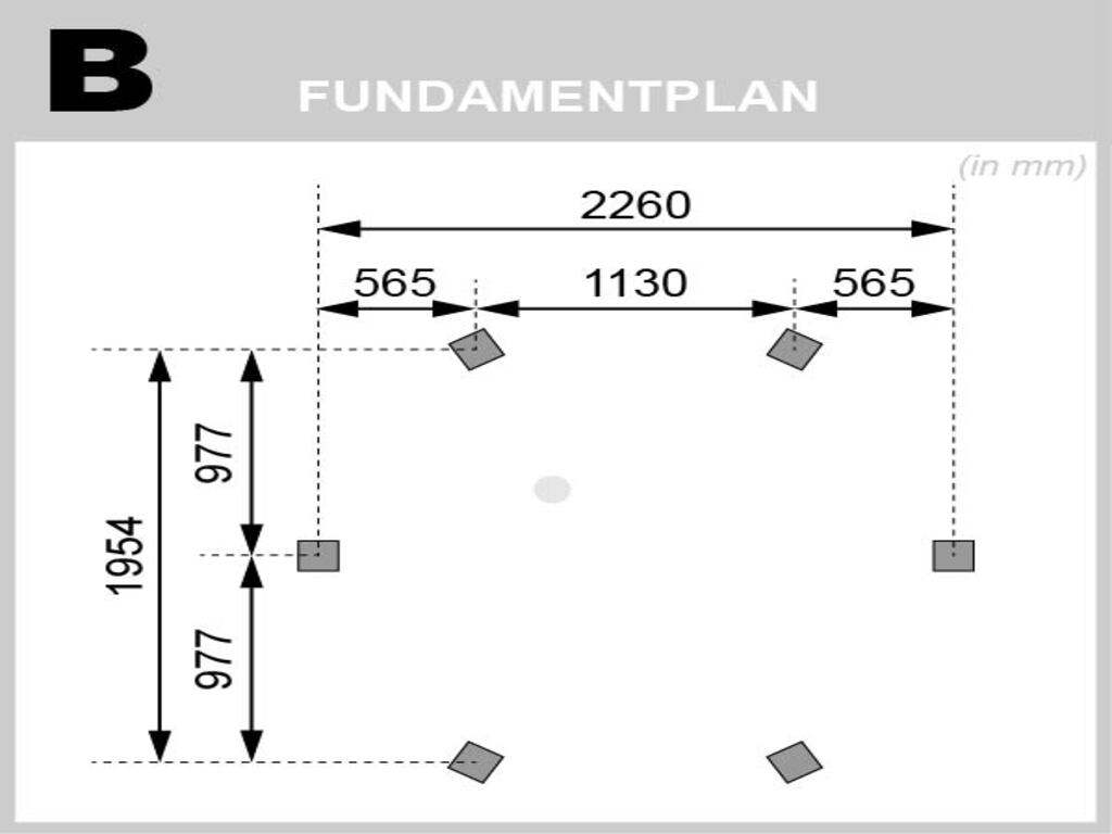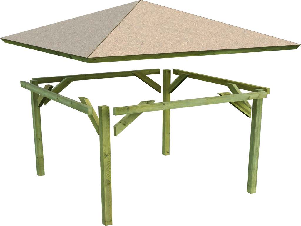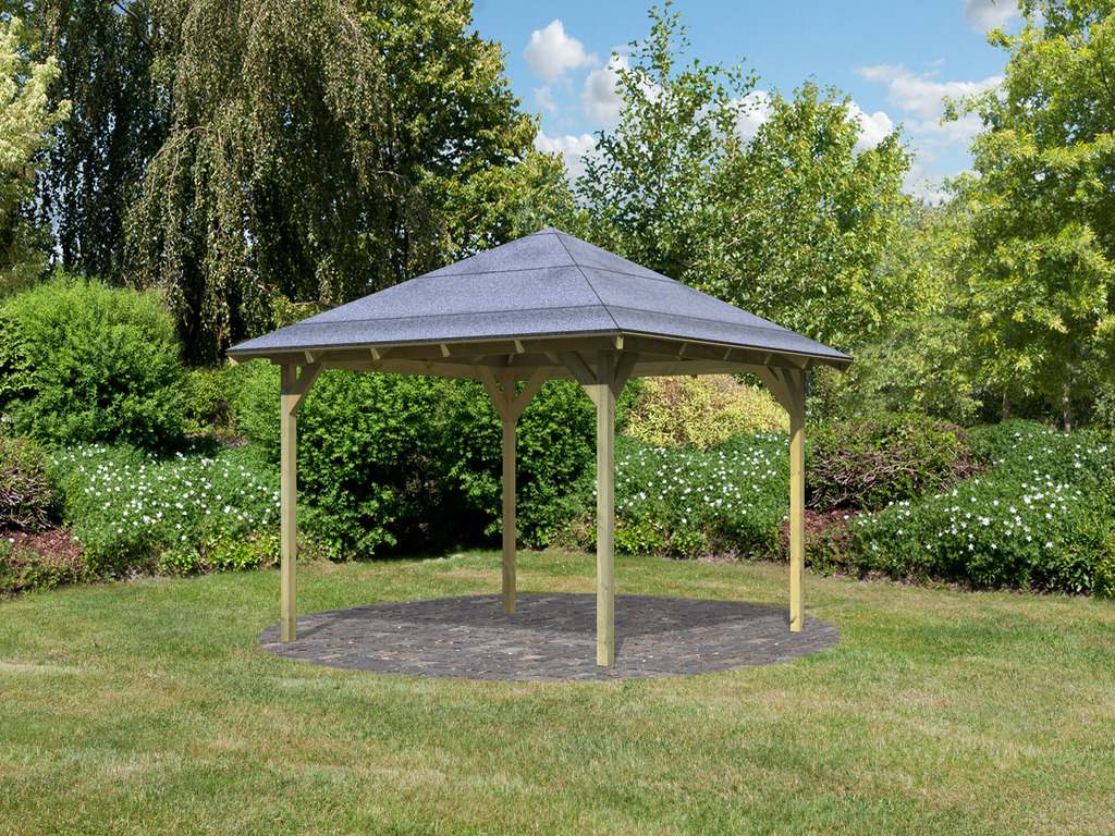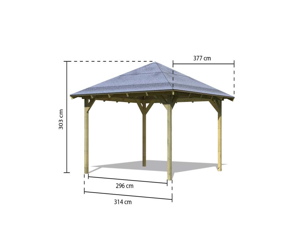 Het zeshoekige paviljoen heeft een buitenmaat van 235 x 208 cm en een dakbasis van 299 x 260 cm. De zijhoogte is 199 cm, de rand meet 280 cm. Het strakke hippe dak wordt ondersteund door 6 palen, elk 9 x 9 cm dik. De palen en andere dwarsverbinders zijn onder druk geïmpregneerd en daardoor goed beschermd tegen weersinvloeden. Wij raden het gebruik van onze geschikte H-ankers met een lengte van 60 cm aan voor de bevestiging in de ondergond