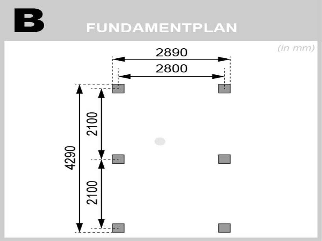 B x D x H: 289 x 429 x 296cm, 9 x 9cm massief houten palen, dakstaander: 345 x 485 cm, vereiste paalverankering: 6 stuks
