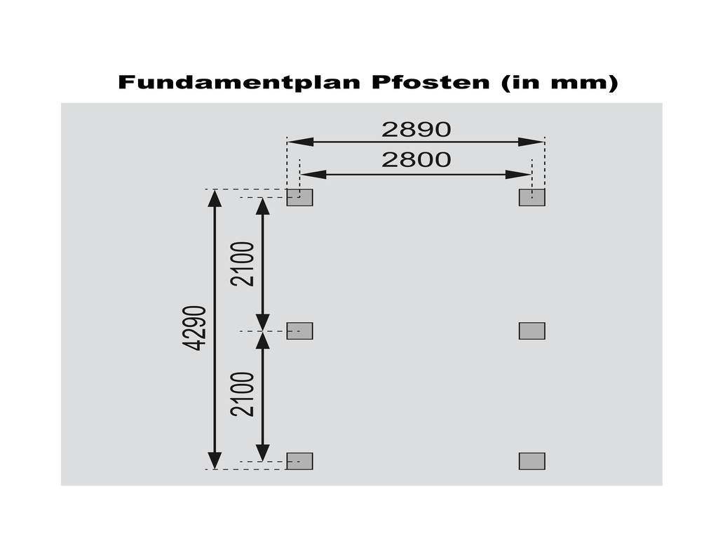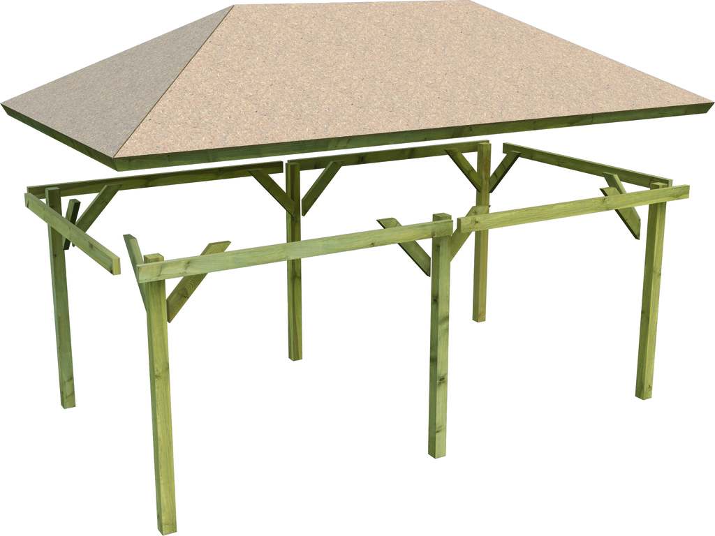 B x D x H: 289 x 429 x 296 cm, druk geïmpregneerd, 9 x 9 cm massief houten palen, dakstaander: 345 x 485 cm, paalanker