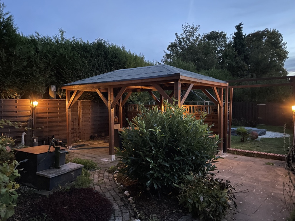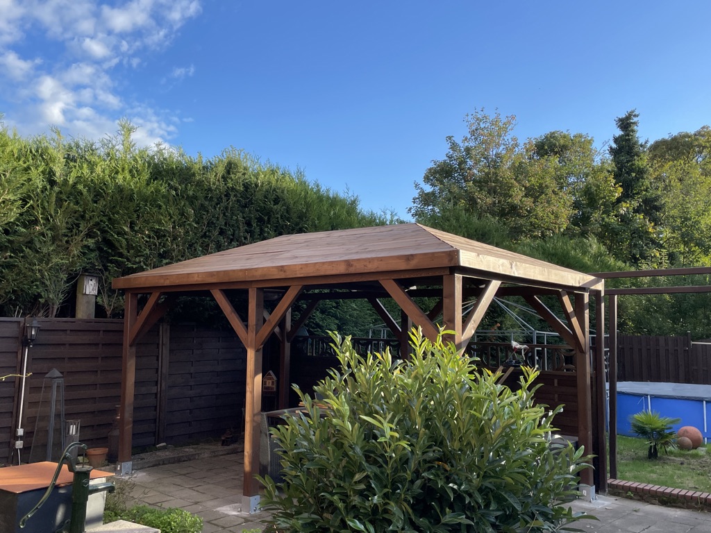 Het paviljoen is erg mooi en stabiel. Het gesneden hout is zeer trouw aan de maat. Voor het sorteren heb je echter ruimte nodig. De standaard schroeven uit de levering heb ik vervangen door RVS schroeven om het paviljoen blijvend stabiel te maken. Zeker een aanrader, levering met kraan ging ook snel en eenvoudig.