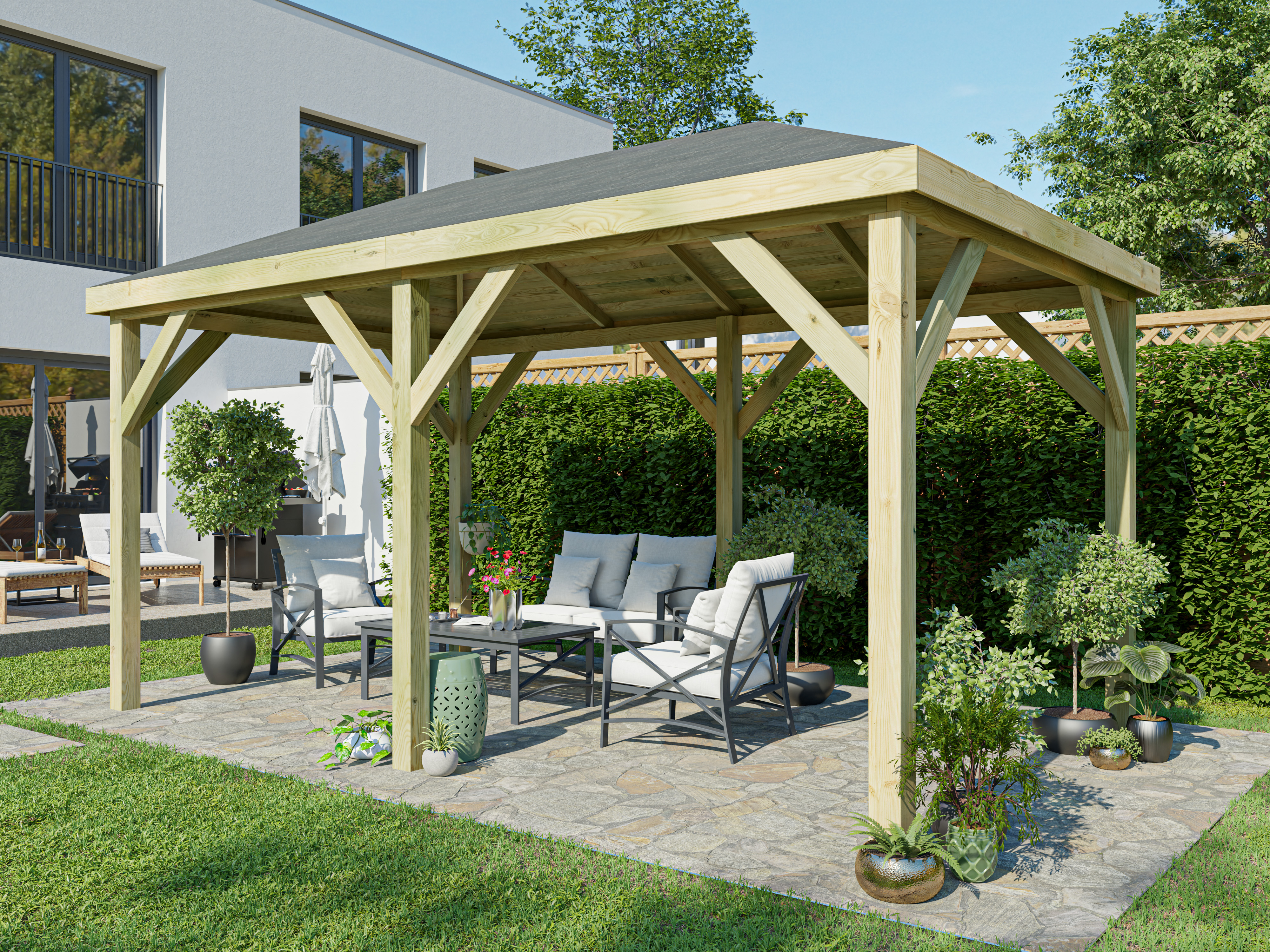 Het paviljoen is gemaakt van stevig dennenhout. Bovendien beschermt de hoogwaardige impregnatie het hout tegen weerinvloeden.