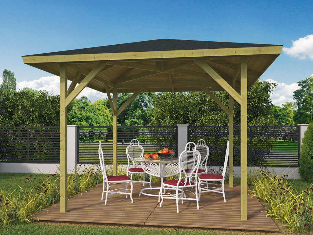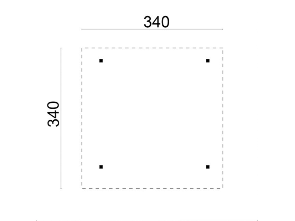 B x D x H: 340 x 340 x 301 cm, vierkant dak, sokkelafmetingen B x D: 260 x 260 cm, paaldikte: 8 x 8 cm