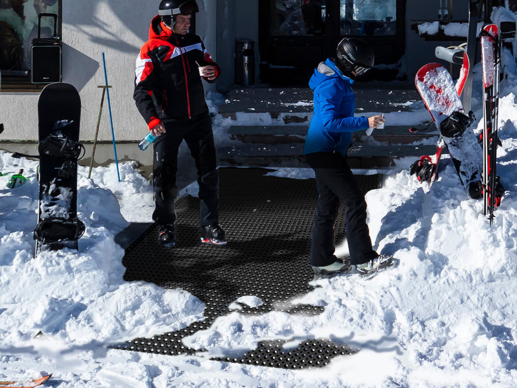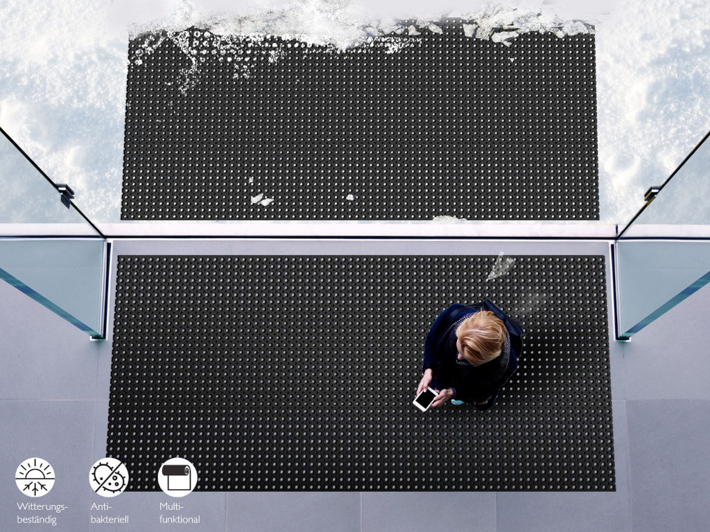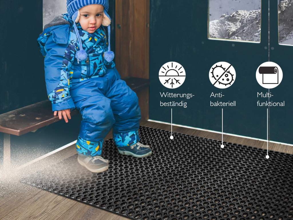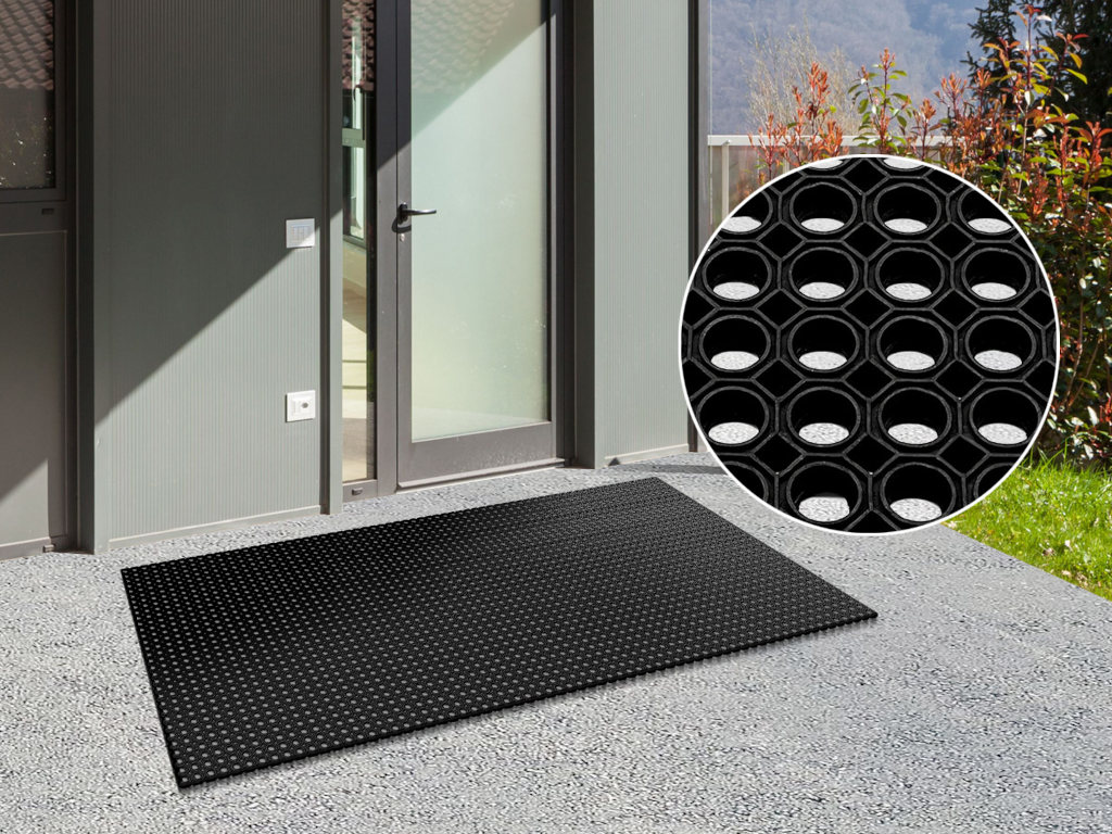 De toepassingsmogelijkheden van de ringgummimat zijn dankzij de speciale honingraatstructuur en het robuuste materiaal vrijwel onbeperkt. Bij gebruik buiten, bij de ingang, in de tuin of op het terras kan water via de gaten weglopen en wordt plasvorming zo voorkomen. Het stevige natuurrubber verwijdert betrouwbaar vuil van schoenzolen en is in de stal of garage onmisbaar. Het antislip oppervlak van de rubbermat zorgt in sneeuwrijke gebieden en zelfs bij ijs en gladheid voor de nodige veiligheid bij het lopen. Bovendien is de ringgummimat zeer slijtvast en bestand tegen zware belasting, waardoor hij ook ideaal is voor opslag- en productiehallen. Slechte weersomstandigheden en extreme temperaturen deren haar niet, zowel binnen als buiten.