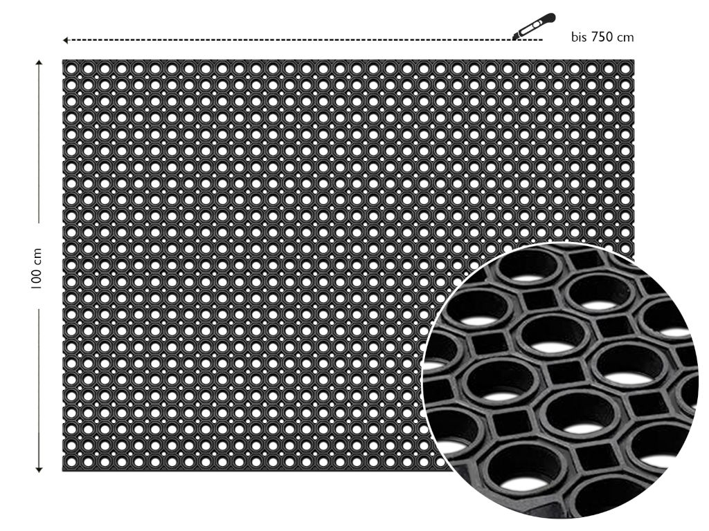 De ringgummimat is als meterwaar verkrijgbaar en kan individueel op maat worden gesneden. Ze heeft een vaste breedte van 100 cm, de lengte is vrij te kiezen tussen 100 en 750 cm.