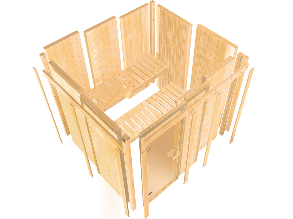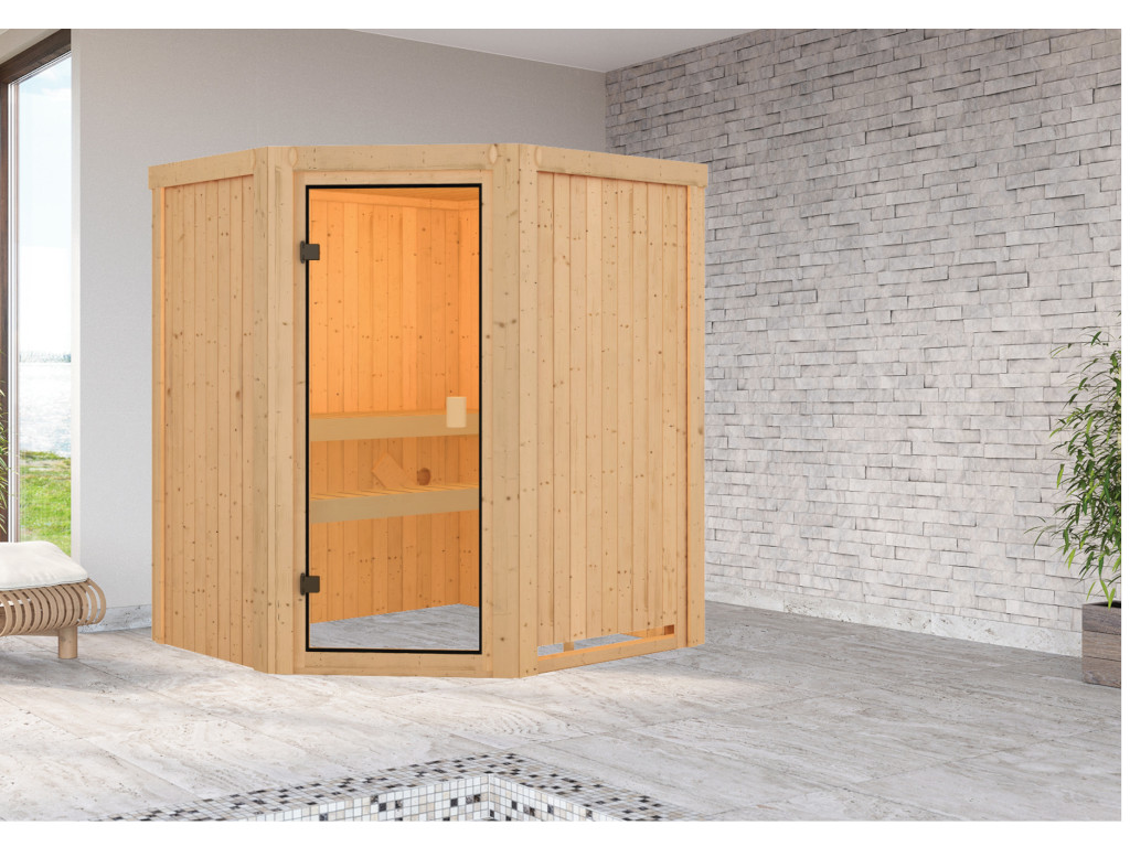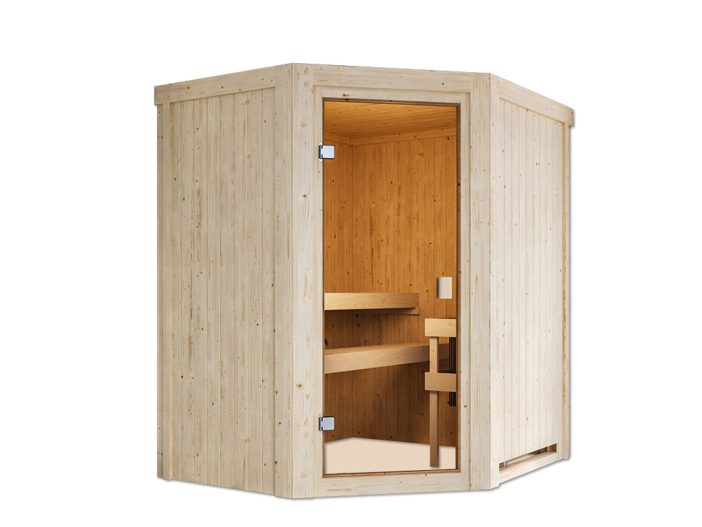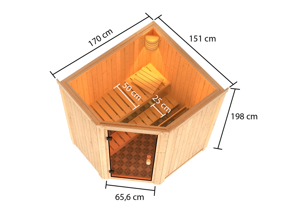 Om dit sauna-aanbod compleet te maken, adviseren wij een 3,6 kW saunakachel of 3,6 kW bio-saunakachel met externe bediening, een saunalamp en/of een gekleurd licht evenals saunastenen en de 6-delige accessoireset als basisuitrusting. Zie hiervoor ons assortiment accessoires.
