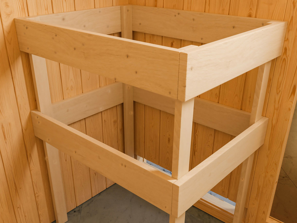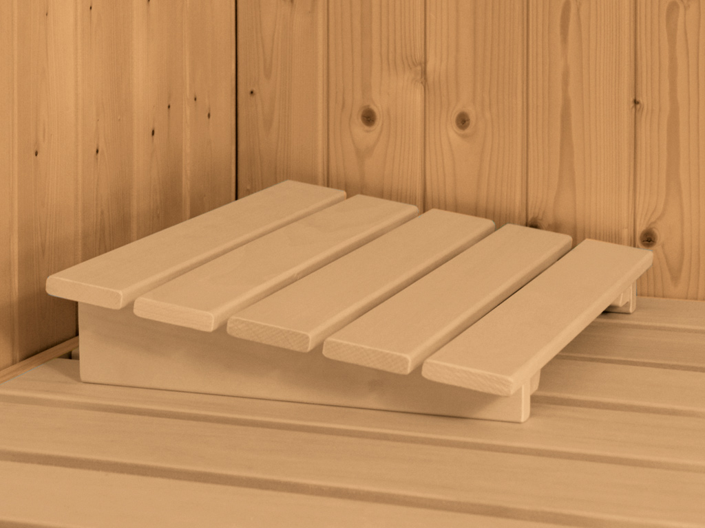 De twee stabiele banken van vurenhout verhogen het comfort in deze binnensauna. Bovendien zijn een kachelbeschermingsrooster en een hoofdsteun van massief vurenhout bij de levering inbegrepen. - Aanbevolen accessoires
