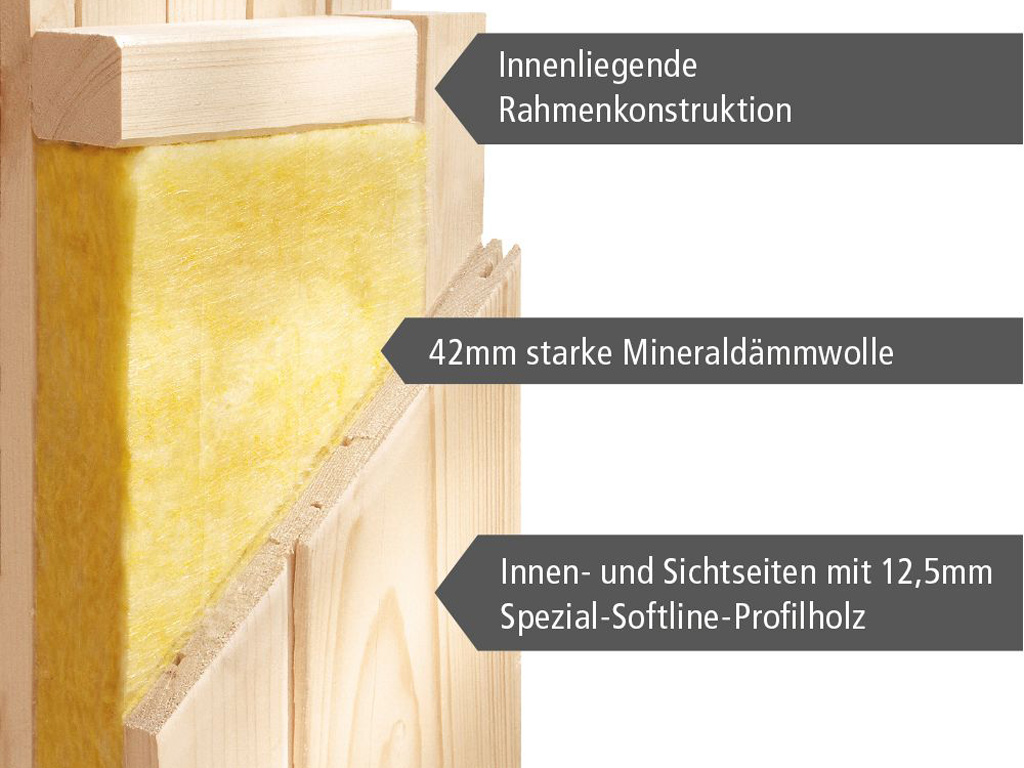 De 68 mm-systeemsauna bestaat uit geprefabriceerde wandelementen waarin een 42 mm minerale wolisolatielaag is ingebed. Dit ontwerp zorgt voor een laag energieverbruik en vereenvoudigt de constructie. De zichtbare zijden van de buitenwand en de binnenzijden zijn bedekt met 12,5 mm speciaal softline geprofileerd hout. - Gebronsde volledig glazen deur