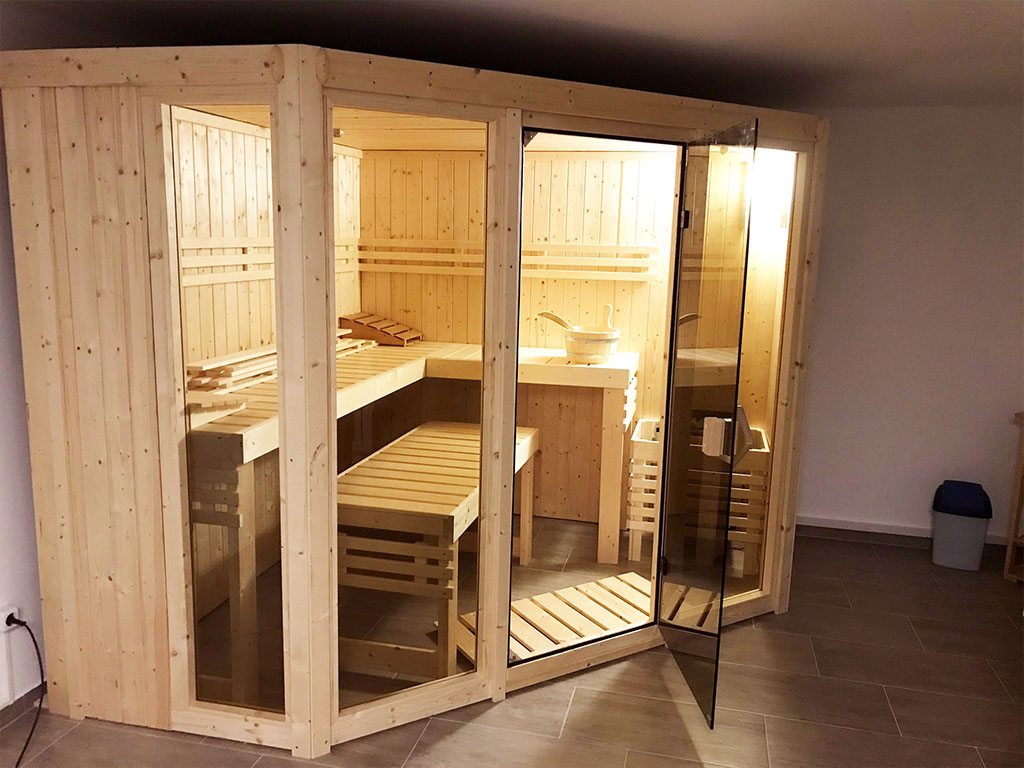 - Saunabedden: De sauna-ervaring is bijzonder comfortabel op 3 ligstoelen. De volgende saunabanken worden meegeleverd: 2 ligbedden, elk ca. 57 cm breed, 1 horizontaal ligbed, ca. 52 cm breed, massief sparrenhout.
