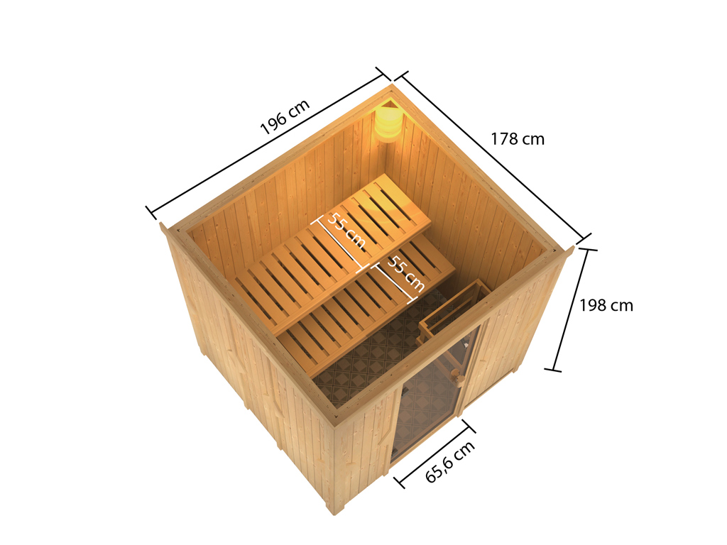 - Saunabedden: De sauna-ervaring is bijzonder comfortabel op 2 ligstoelen. De volgende saunabanken worden meegeleverd: 2 ligbanken, elk ongeveer 55 cm breed, massief sparrenhout.