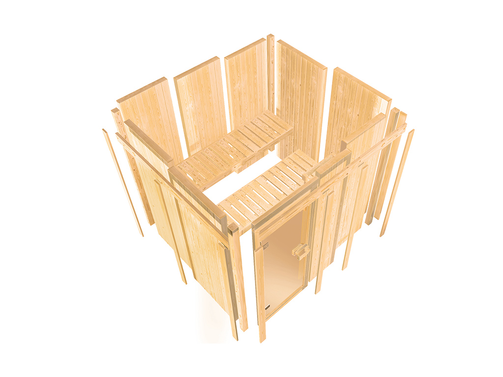 Dit saunamodel - een systeemsauna - wordt gekenmerkt door zijn speciale sandwichconstructie, d.w.z. de wandelementen bestaan uit afzonderlijke lagen. De geprefabriceerde wandelementen maken een snelle montage binnen enkele uren mogelijk.