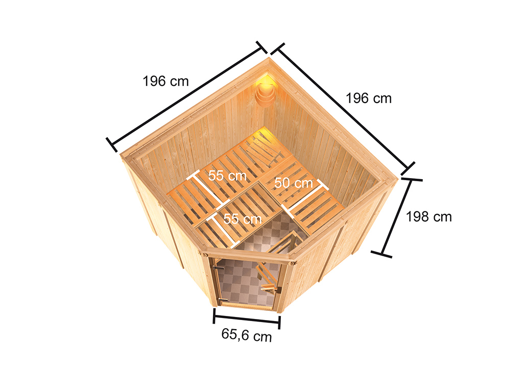 B x D x H: 196 x 196 x 198 cm, 3 banken, incl. 6,8 kW Glow saunakachel, externe bedieningseenheid