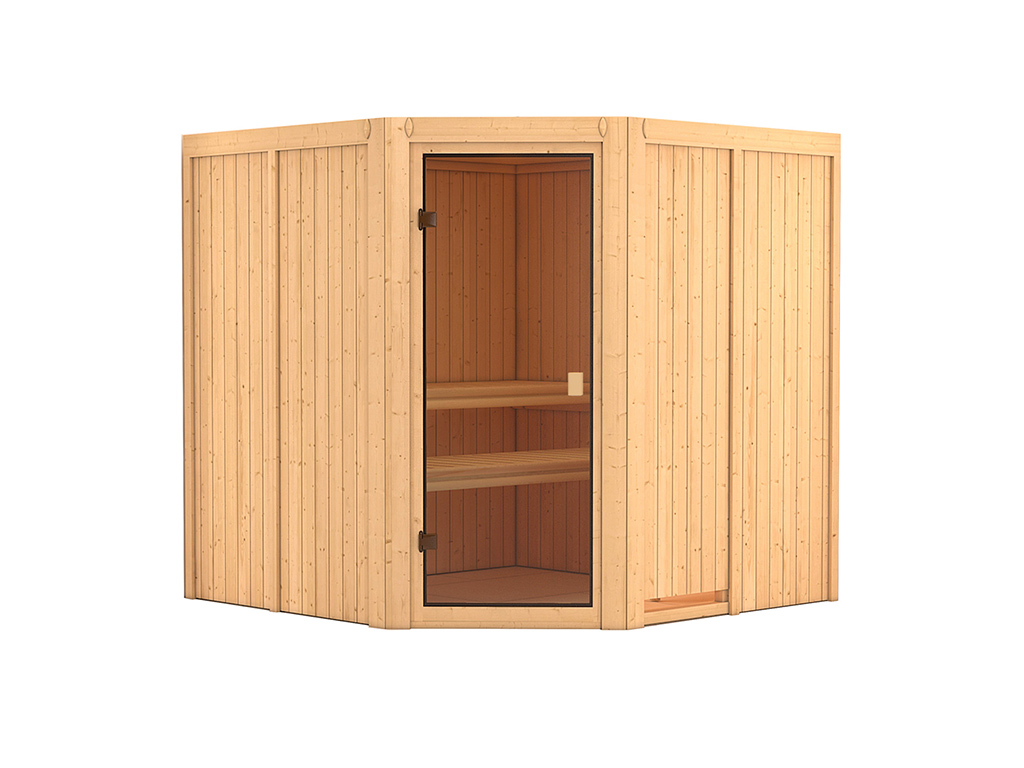 3 ligbanken, 6,8 kW saunakachel, ext. bedieningsunit, 1 hoofdsteun van espen, kachelbeschermingsrooster van massief sparrenhout (B 60 x D 51 x H 80 cm), beslag en montagehandleiding.