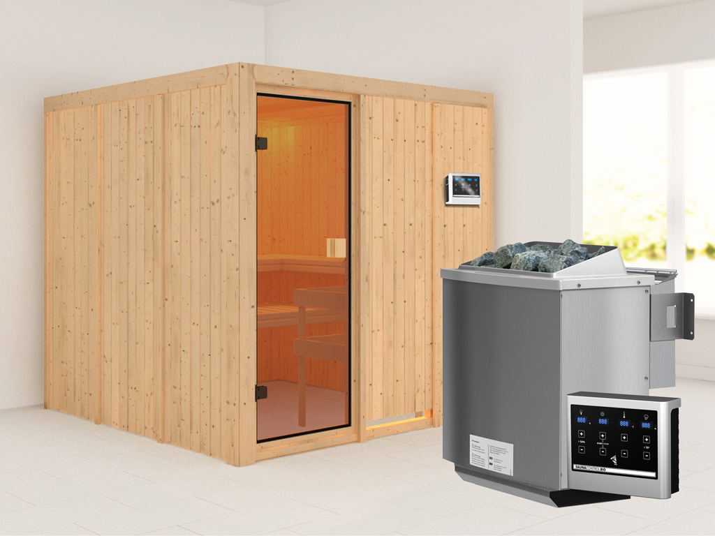 Deze binnensauna wordt geleverd inclusief saunakachel met externe bedieningsunit. Door deze aan de buitenkant van de sauna te bevestigen, is een praktische bediening vóór het saunabezoek mogelijk evenals een nog nauwkeurigere instelling van de temperatuur. Ook andere elektrische apparaten, zoals cabineverlichting, kunnen op de externe bedieningsunit worden aangesloten en ermee worden bediend.