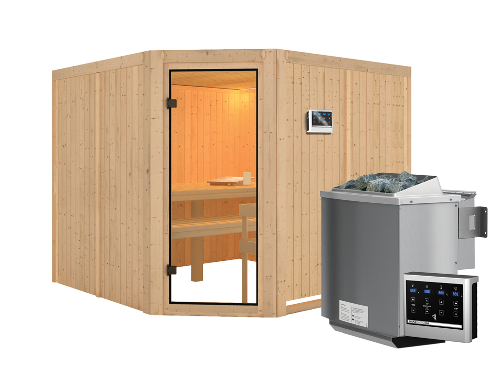 | Leveringsomvang: | 3 ligbanken, BBio-combikachel 9 kW, ext. bediening, 1 hoofdsteun van espenhout, kachelbeschermingsrooster van massief sparrenhout, beslag, montagehandleiding. |