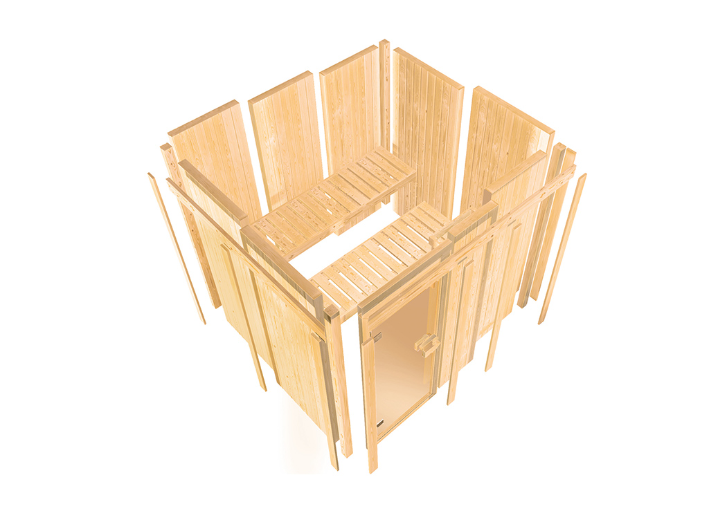 2 ligbanken, 6,8 kW saunakachel, ext. bedieningsunit, 1 hoofdsteun van espen, kachelbeschermingsrooster van massief vurenhout (B 60 x D 51 x H 80 cm), beslag en montagehandleiding