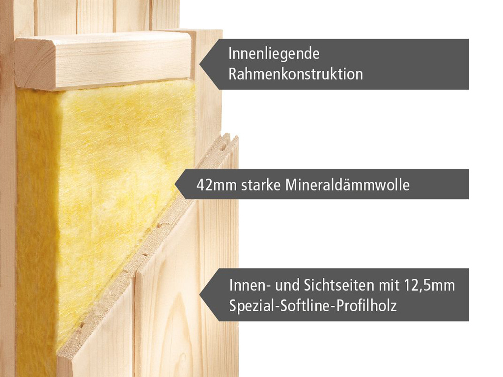 De buitenwanden van de zichtzijden bestaan ​​uit twee 12,5 mm dikke lagen ademend, vochtregulerend speciaal Softline profielhout en een 42 mm dikke laag minerale isolatiewol. Het 57 mm dikke dak is voorzien van een speciaal paneel en minerale isolatiewol. Met een wanddikte van 68 mm zijn systeemsauna's optimaal geïsoleerd en daardoor bijzonder energiebesparend. Door de uitstekend geïsoleerde elementen warmt de systeemsauna extra snel op.