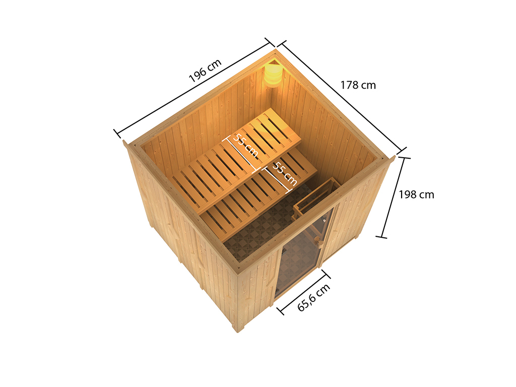 B x D x H: 196 x 178 x 198 cm, 2 ligbedden, incl. 6,8 kW Glow saunakachel, externe bedieningseenheid